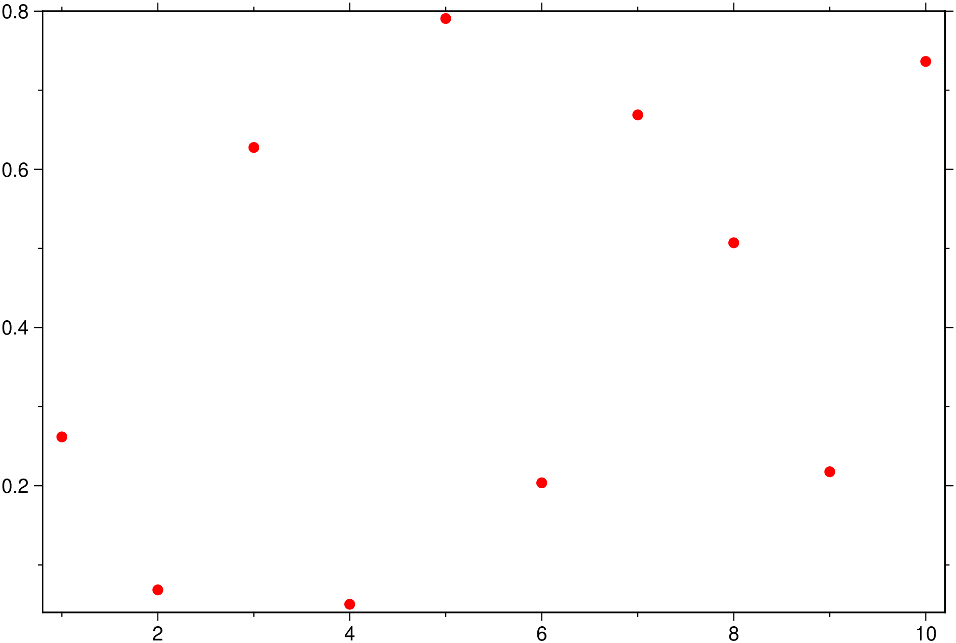 :circle, size is symbol size in cm, unless unit is specified i.e. :pointsIn alternative to the symbol keyword, user can select the symbol name with either marker or shape and symbol size with markersize or ms. The value of these keywords can be either numeric (symb meaning size in cm) or string if an unit is appended, e.g. markersize="5p" This form of symbol selection allows also to specify a variable symbol size. All it’s need for this is that the keyword’s value be an array with the same number of elements as the number of data points.