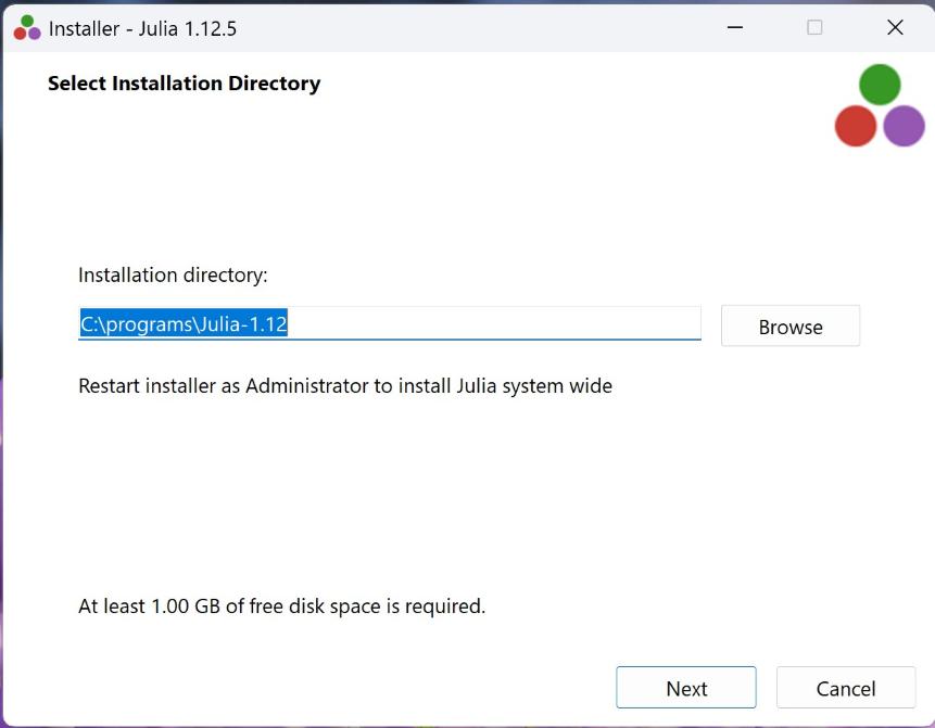On the Select Installation Directory screen, change the path to a visible directory, for example C:\programs\Julia-1.12: