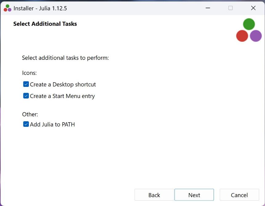 Make sure the “Add Julia to PATH” checkbox is checked. This allows you to run julia from any terminal without having to type the full path to the executable.