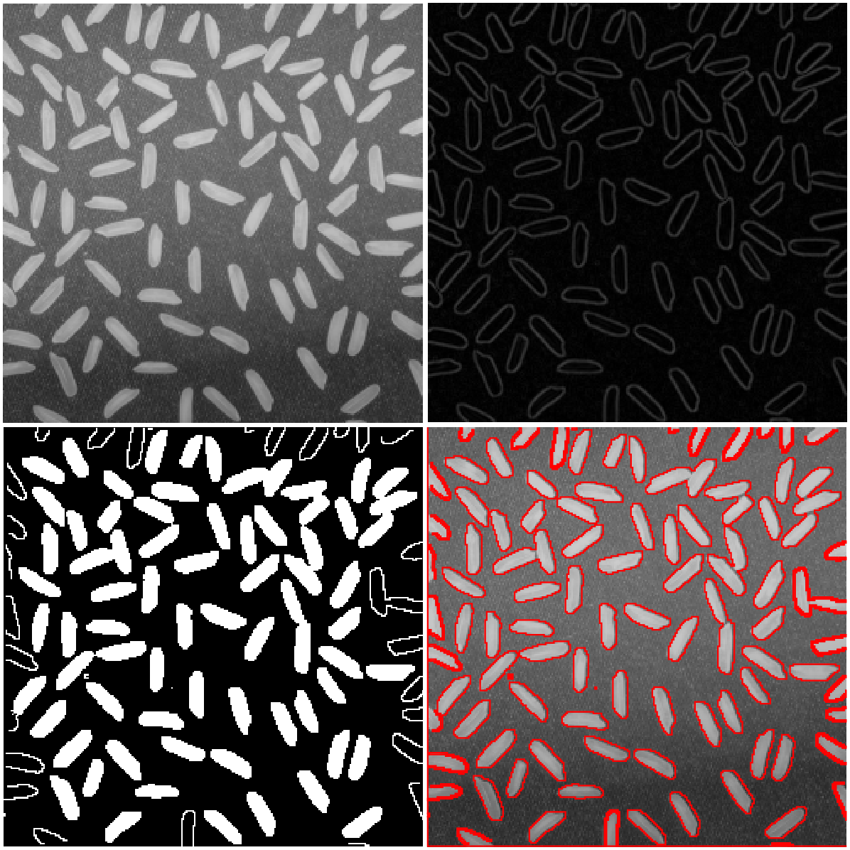 usingGMTI =gmtread(TESTSDIR *"assets/rice.png");J =imsobel(I);BW =binarize(J);BW =bwskell(BW); # Skeletize to get a better approximation of the shapes.BW =imfill(BW); # Fill to avoid "double" vectorization (outside and inside grain outline)D =polygonize(BW);grdimage(I, figsize=5)grdimage!(J, figsize=5, xshift=5.05)grdimage!(BW, figsize=5, xshift=-5.05, yshift=-5.05)grdimage!(I, figsize=5, xshift=5.05, plot=(data=D, lc=:red), show=true)
