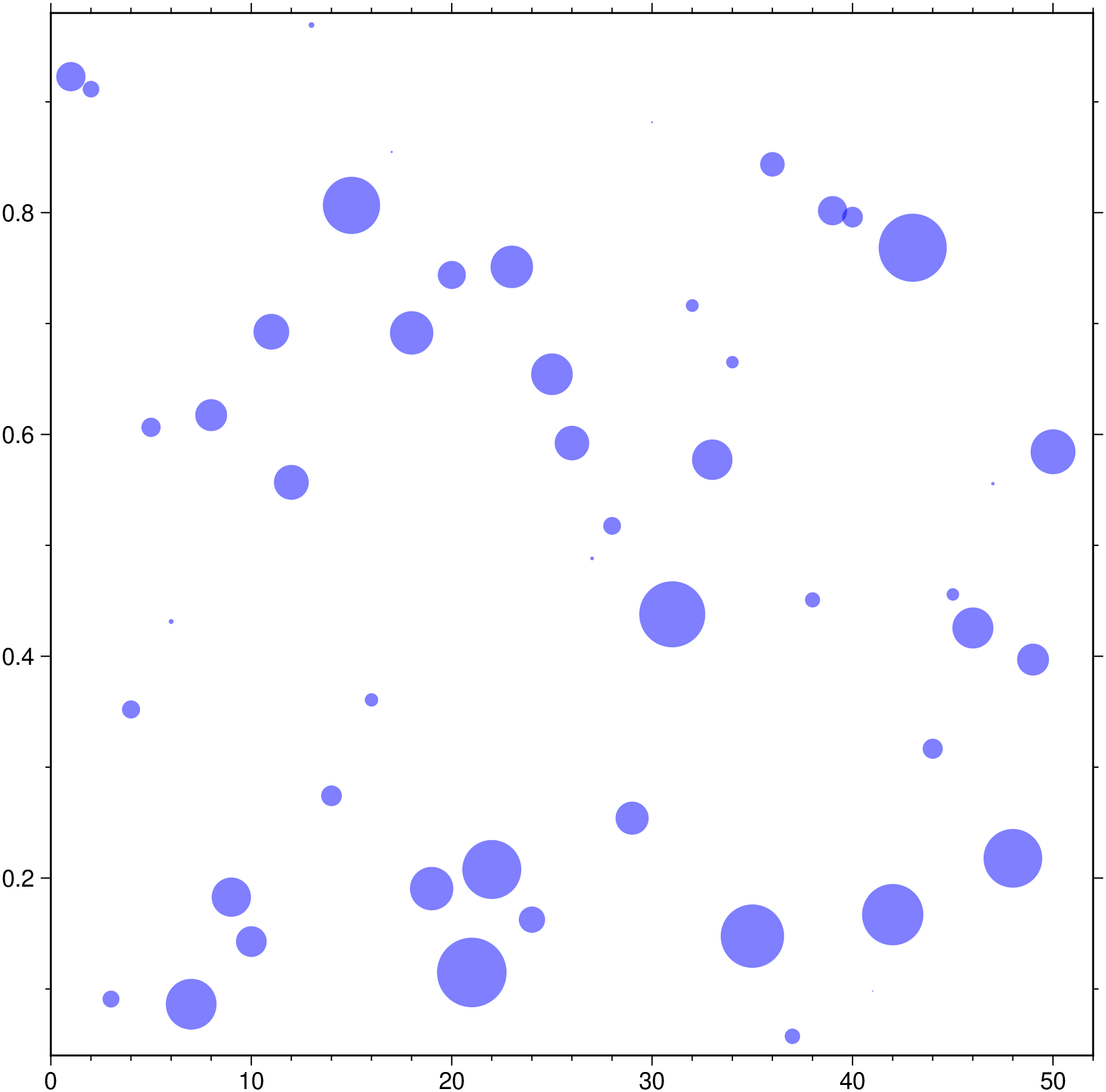 bubblechart(1:50,rand(50), size=rand(50), fill=:blue, alpha=50, aspect="1:1", show=1)