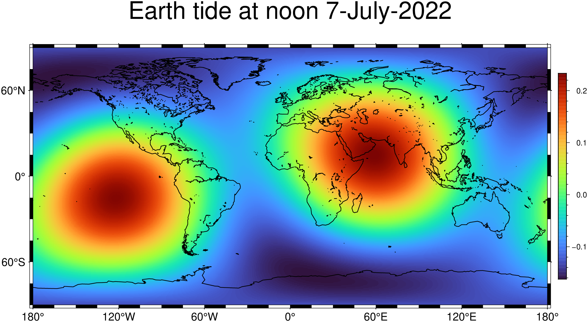 viz(G, coast=true, colorbar=true, title="Earth tide at noon 7-July-2022")