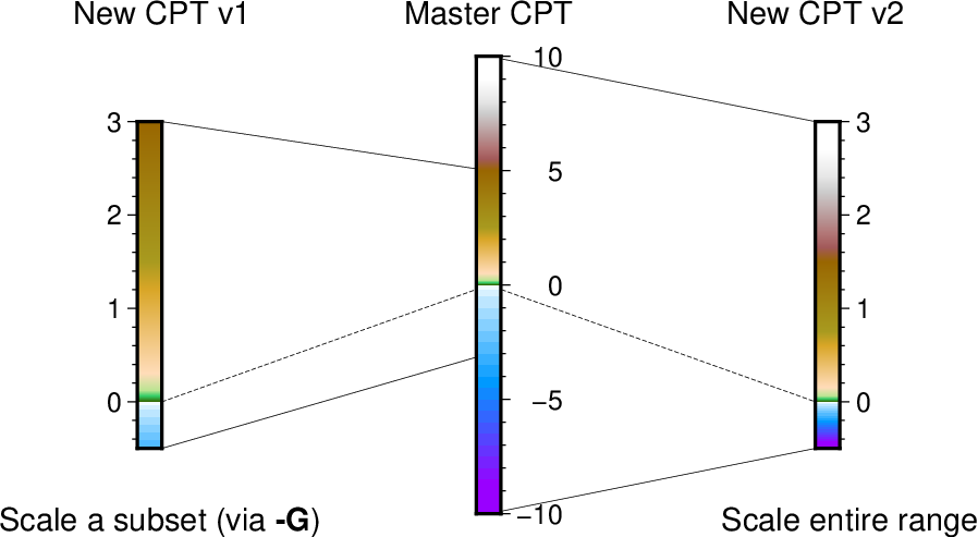If the master CPT includes B, F, and N entries, these will be copied into the new master file. If not, the parameters COLOR_BACKGROUND, COLOR_FOREGROUND, and COLOR_NAN from the gmt.conf file or the command line will be used. This default behavior can be overruled using the options bg, overrule_bg or no_bg.