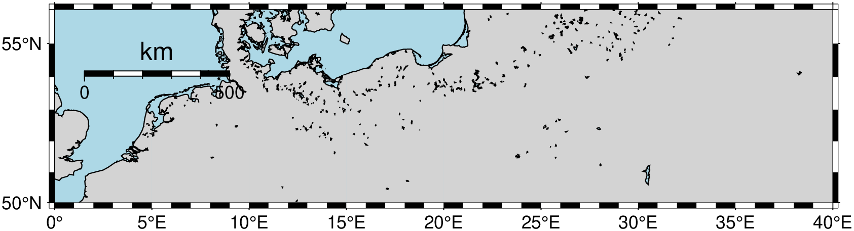A 500 km fancy scale bar on a Mercator map of the North Sea, computed at latitude 53N.