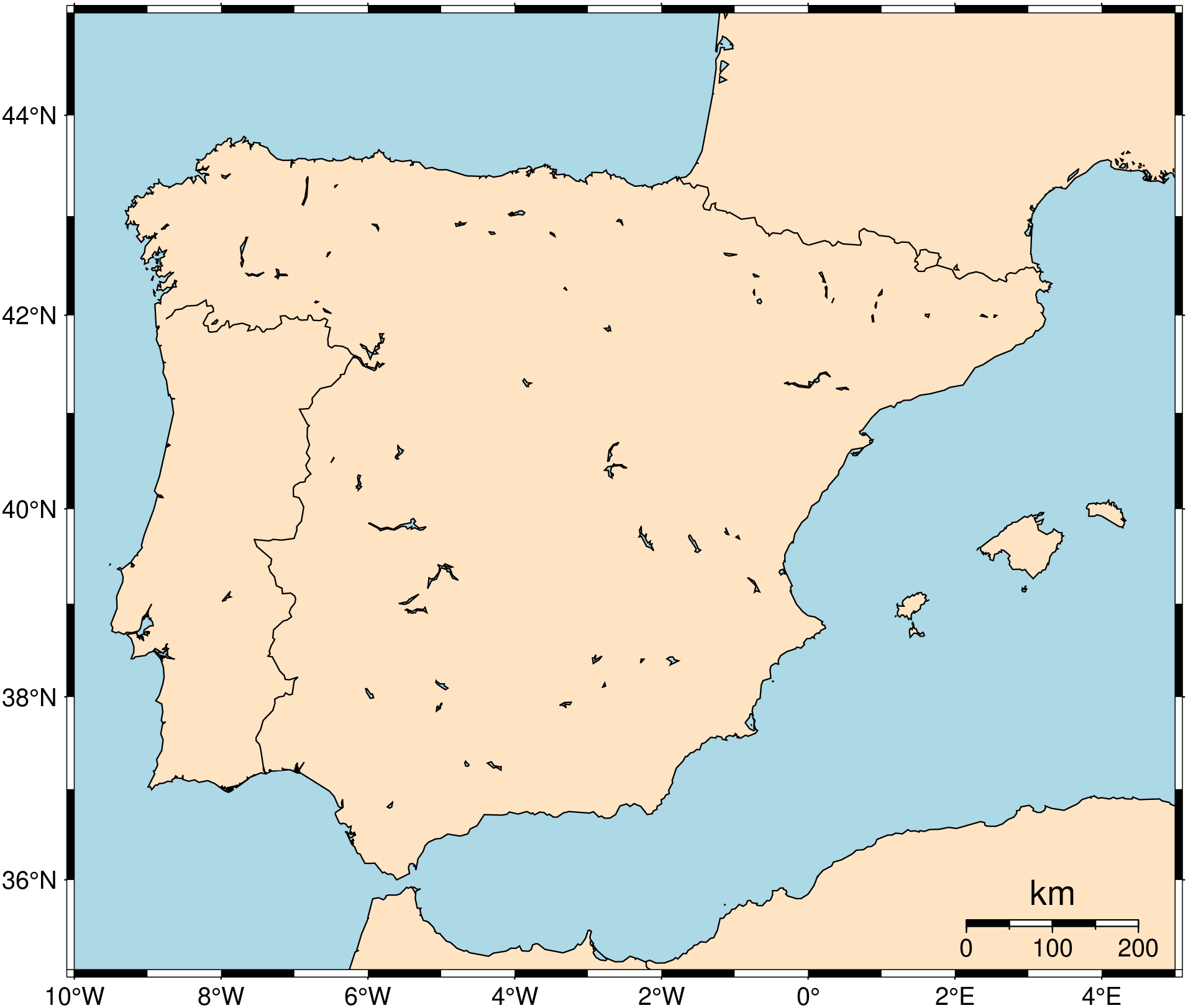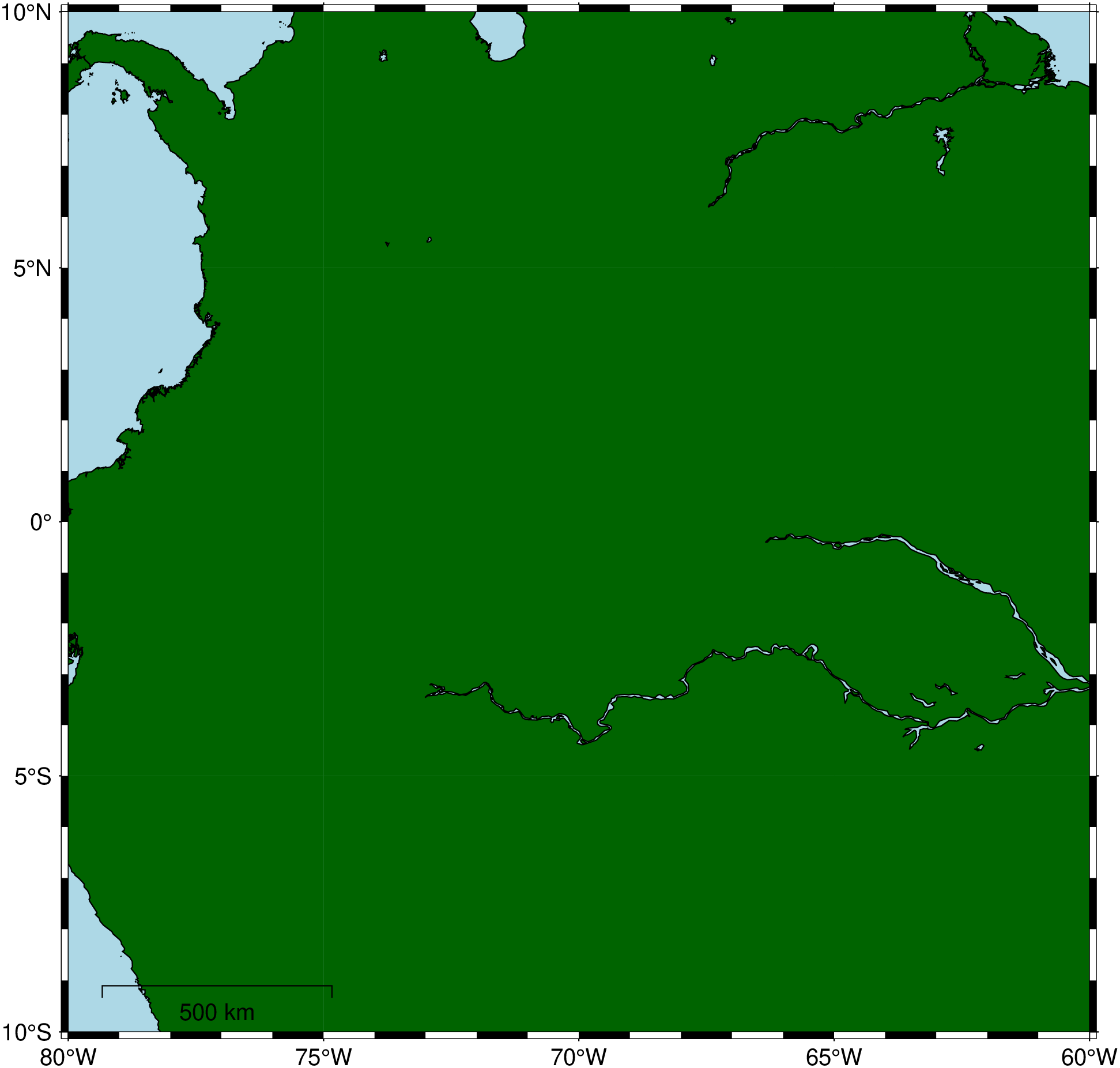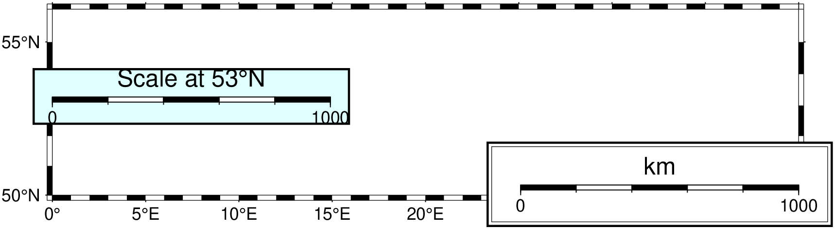 Can be called as an overlay (mapscale!) on an existing plot, or standalone with explicit region and proj. When no explicit frame is given, defaults to frame=:none so that only the scale bar is drawn.