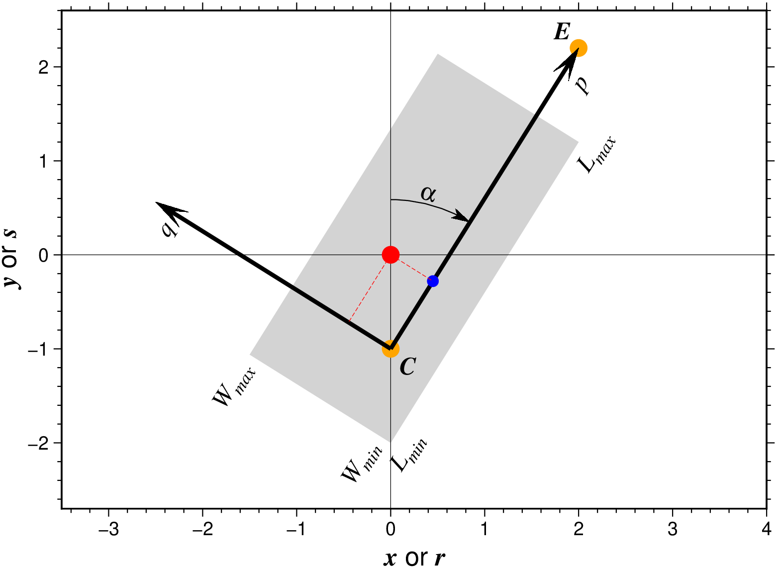 No assumptions are made regarding the units for \(x, y, r, s, p, q\), dist, \(l_{min}, l_{max}, w_{min}, w_{max}\). However, if km is selected, map units are assumed and \(x, y, r, s\), must be in degrees and \(p, q\), dist, \(l_{min}, l_{max}, w_{min}, w_{max}\) will be in km.