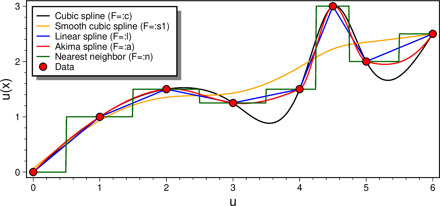 When using the second form (the interp_type=(…)), the first member is the same as above, except the smooth and the derivatives. To select first or second derivative use the :first or :second keywords. Examples of this syntax: interp=(:akima, :first), or interp=(:smoothing, 0.1), or interp=(:smoothing, 0.1, :second).