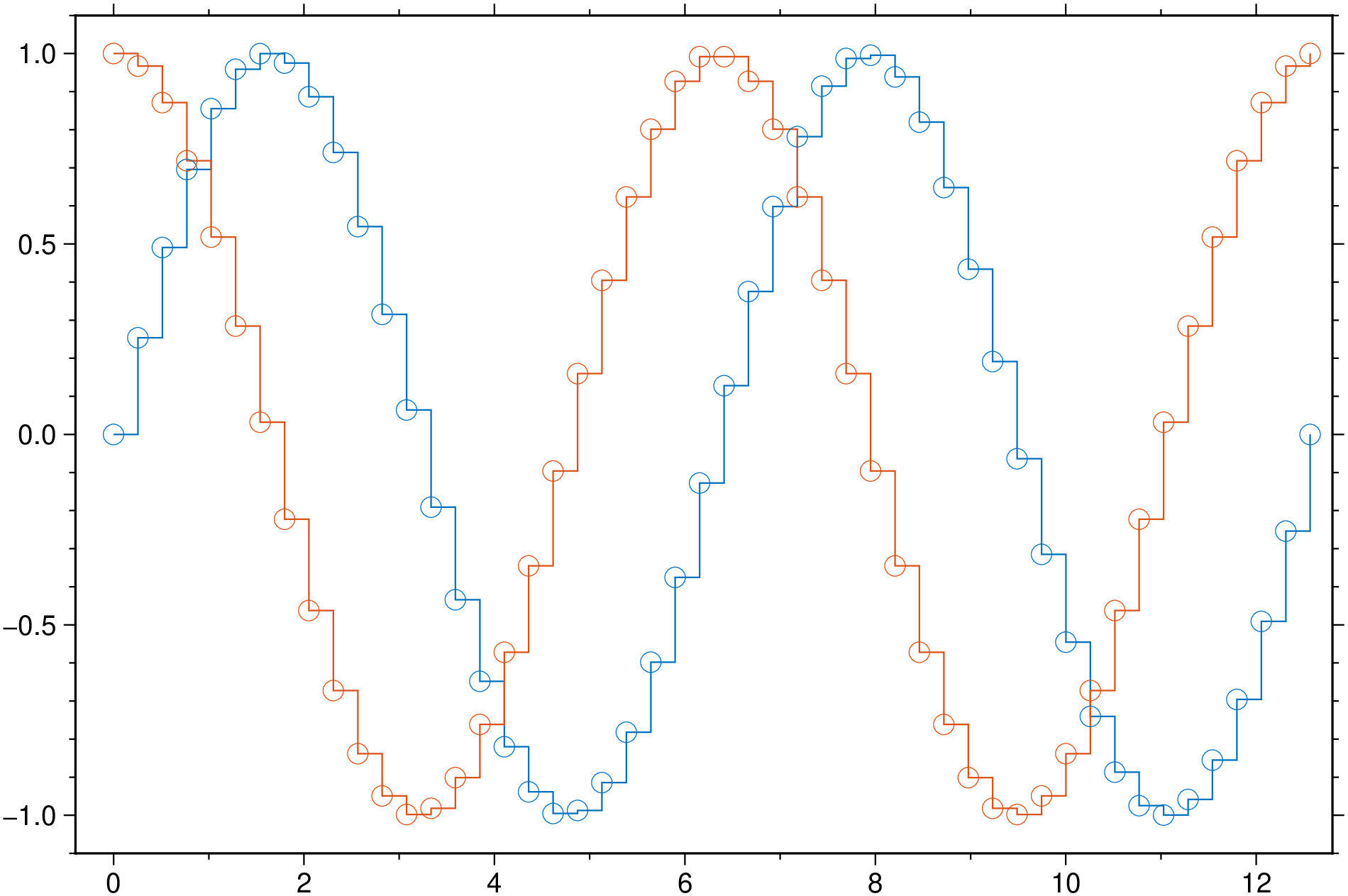Create a stairs plot of sine and a cosine evaluated at same points as above and add a circle marker at the points location. Note that now we are selectiong the columns from teir names in the D GMTdataset.