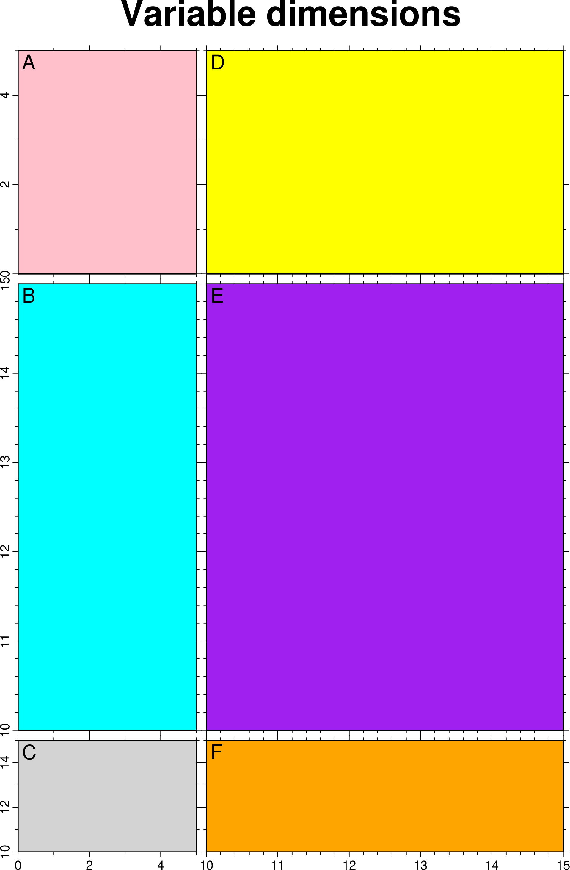 Specify the dimensions of each subplot directly. Then, the figure dimensions are computed from the subplot dimensions after adding the space that optional tick marks, annotations, labels, and margins occupy between subplots. As for other figures, annotations, ticks, and labels along the outside perimeter are not counted as part of the figure dimensions. To specify different subplot dimensions for each row (or column), append a comma-separated list of widths, a slash, and then the comma-separated list of heights. A single number means constant widths (or heights) [Default]. For example dims=(panels=((5,8),8),) will make the first column 5 cm wide and the second column 8 cm wide, with all having a constant height of 8 cm. The number of values must either be one (constant across the rows or columns) or exactly match the number of rows (or columns). For geographic maps, the height of each subplot depends on your map region and projection. There are two options: