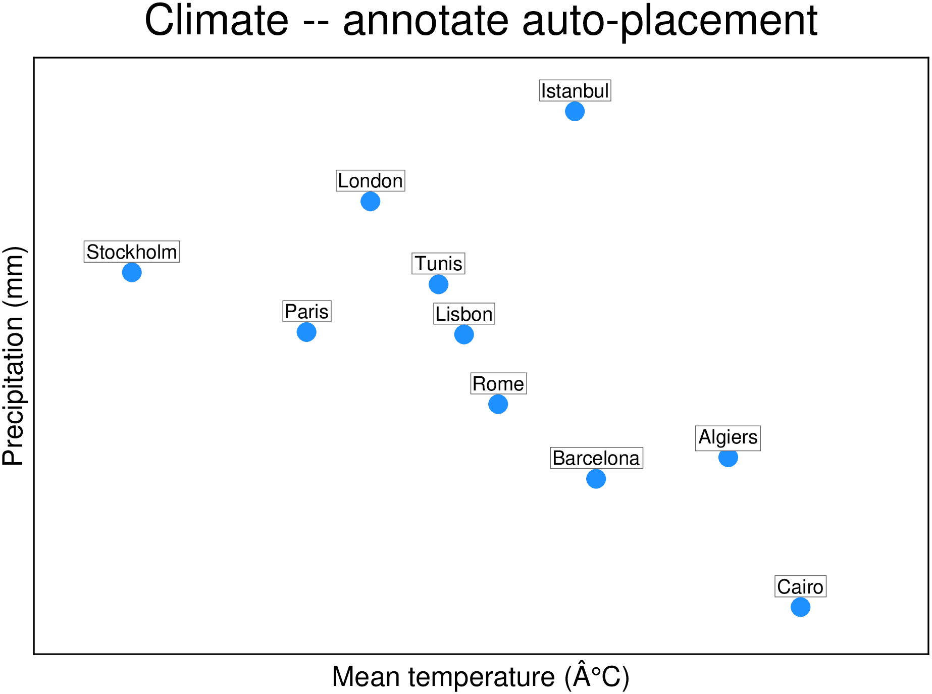 The simplest usage: pass points and labels, and annotate places everything automatically. Label positions are computed by textrepel to avoid overlaps; arrows connect labels to anchors.