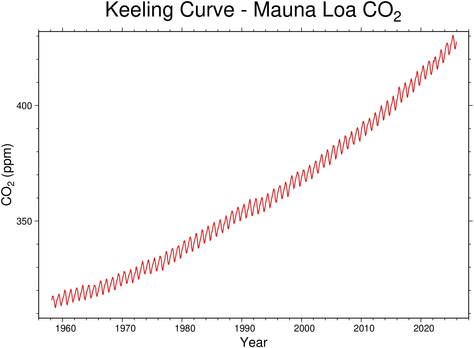 Plot the Keeling Curve - atmospheric CO2 concentration measured at Mauna Loa since 1958.