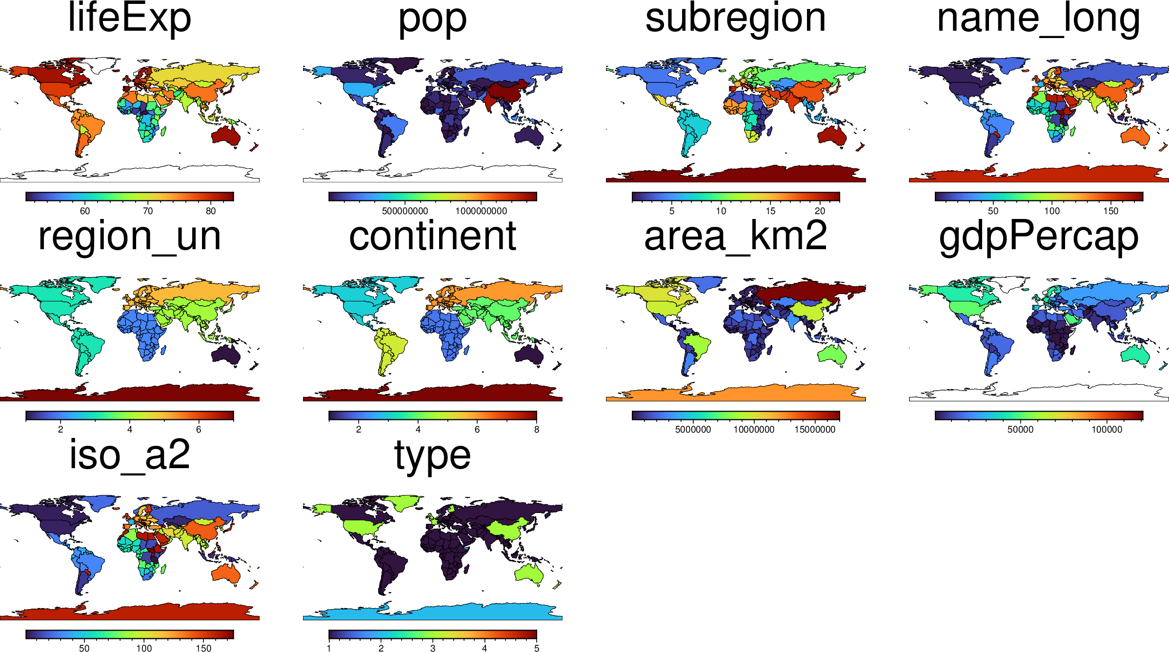 Create a montage of world choropleths using as colr info the values of the attributes of the world.gpkg file