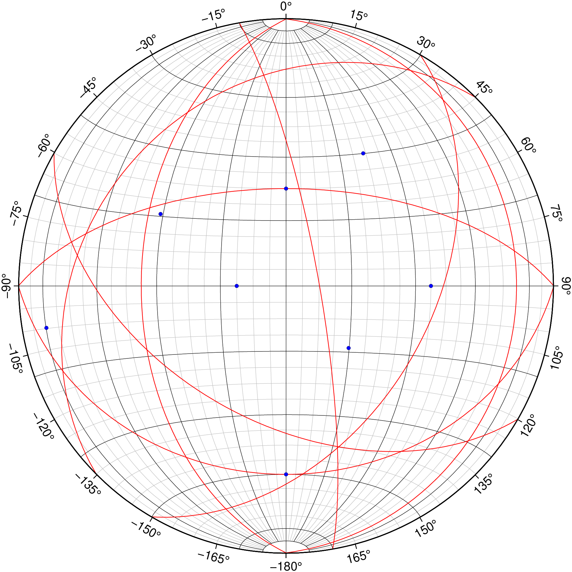 stereonet([90 30; 180 45; 270 60; 0 15; 30 45; 120 48; 225 27; 350 80], show=true)