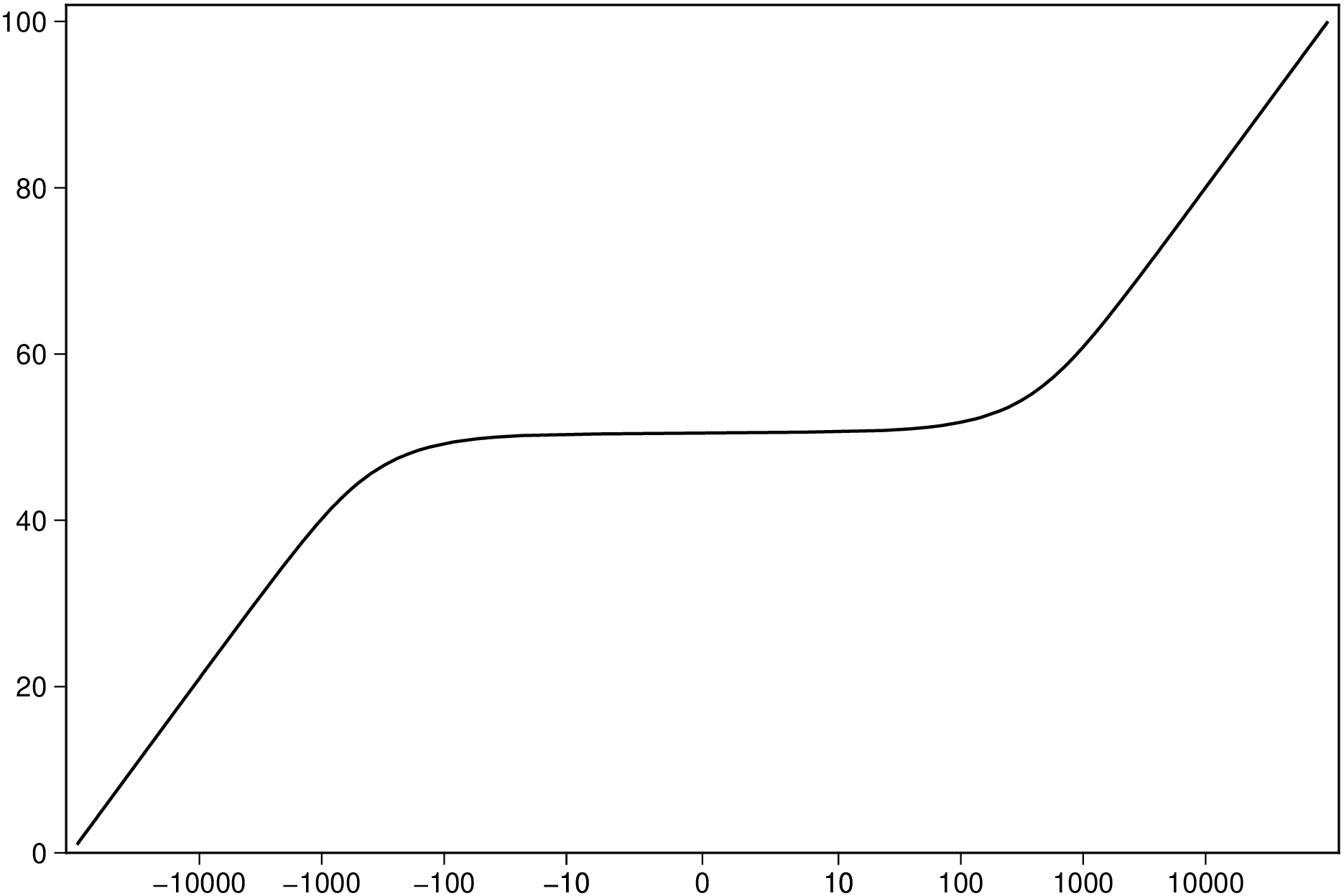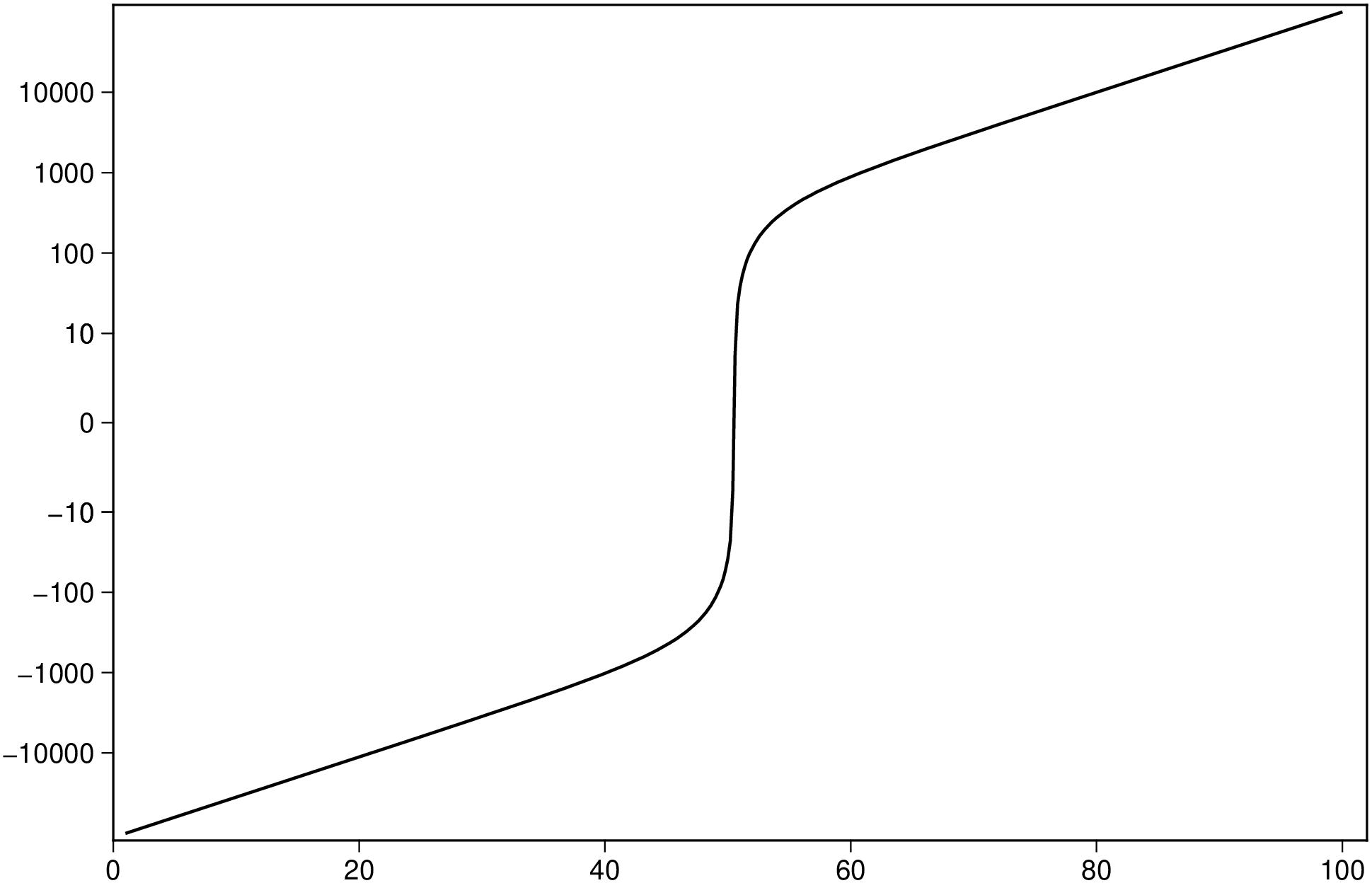 A curve spanning several orders of magnitude in both positive and negative directions. The symlog scale compresses the extremes while keeping a linear region near zero.