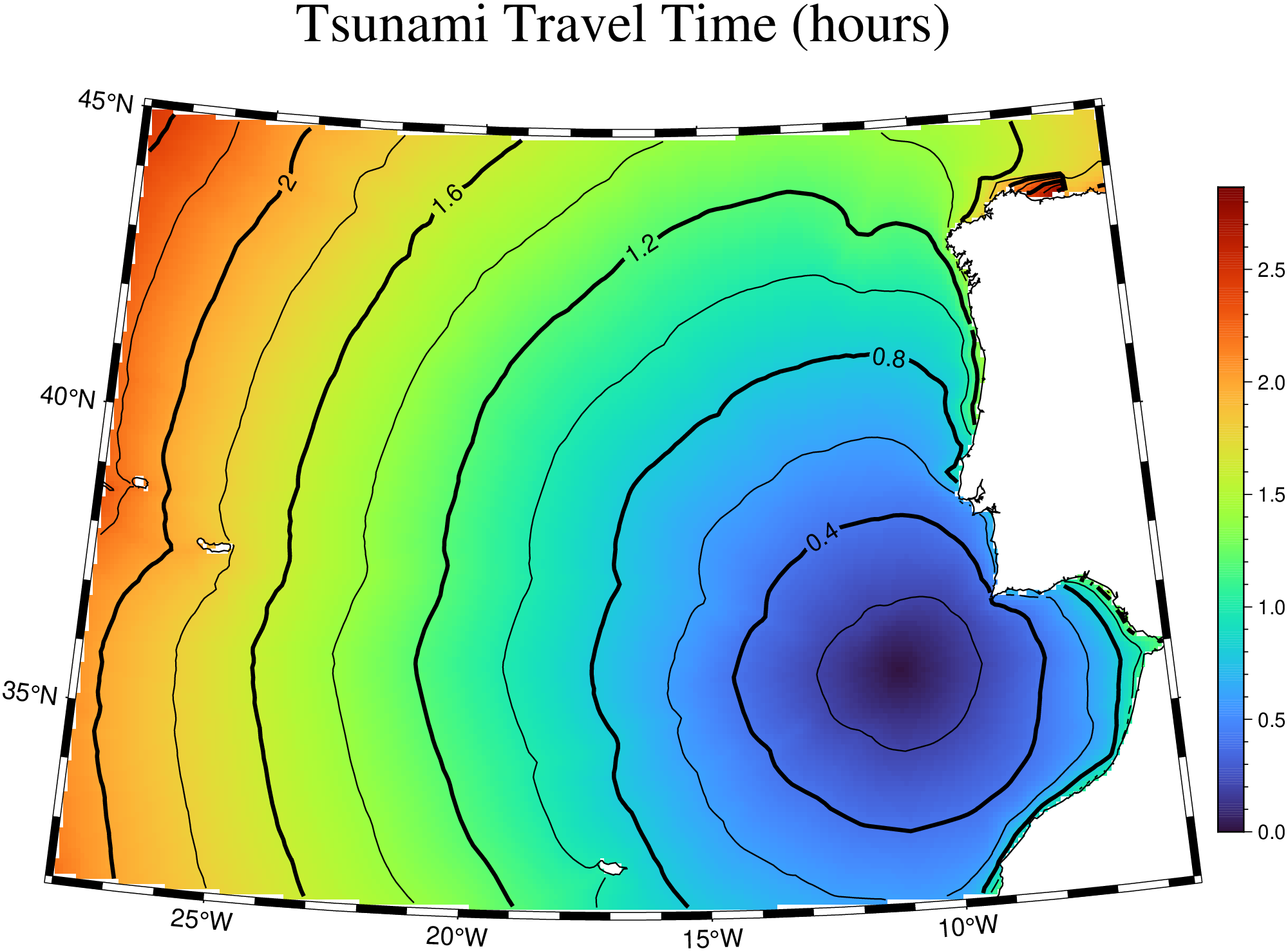 The result is returned as a GMTgrid with travel times in hours (NaN where the wave does not reach, e.g., on land).