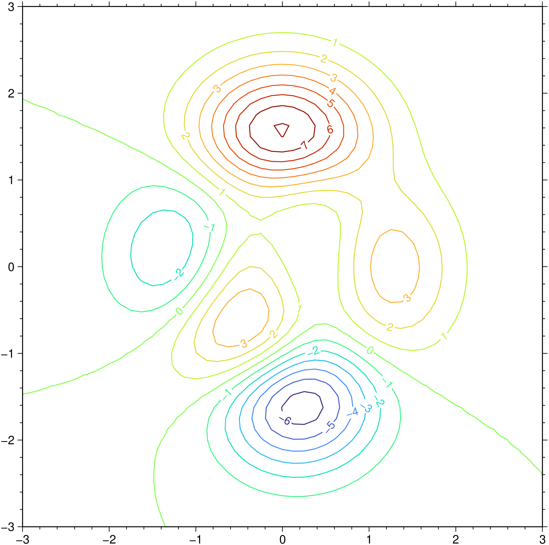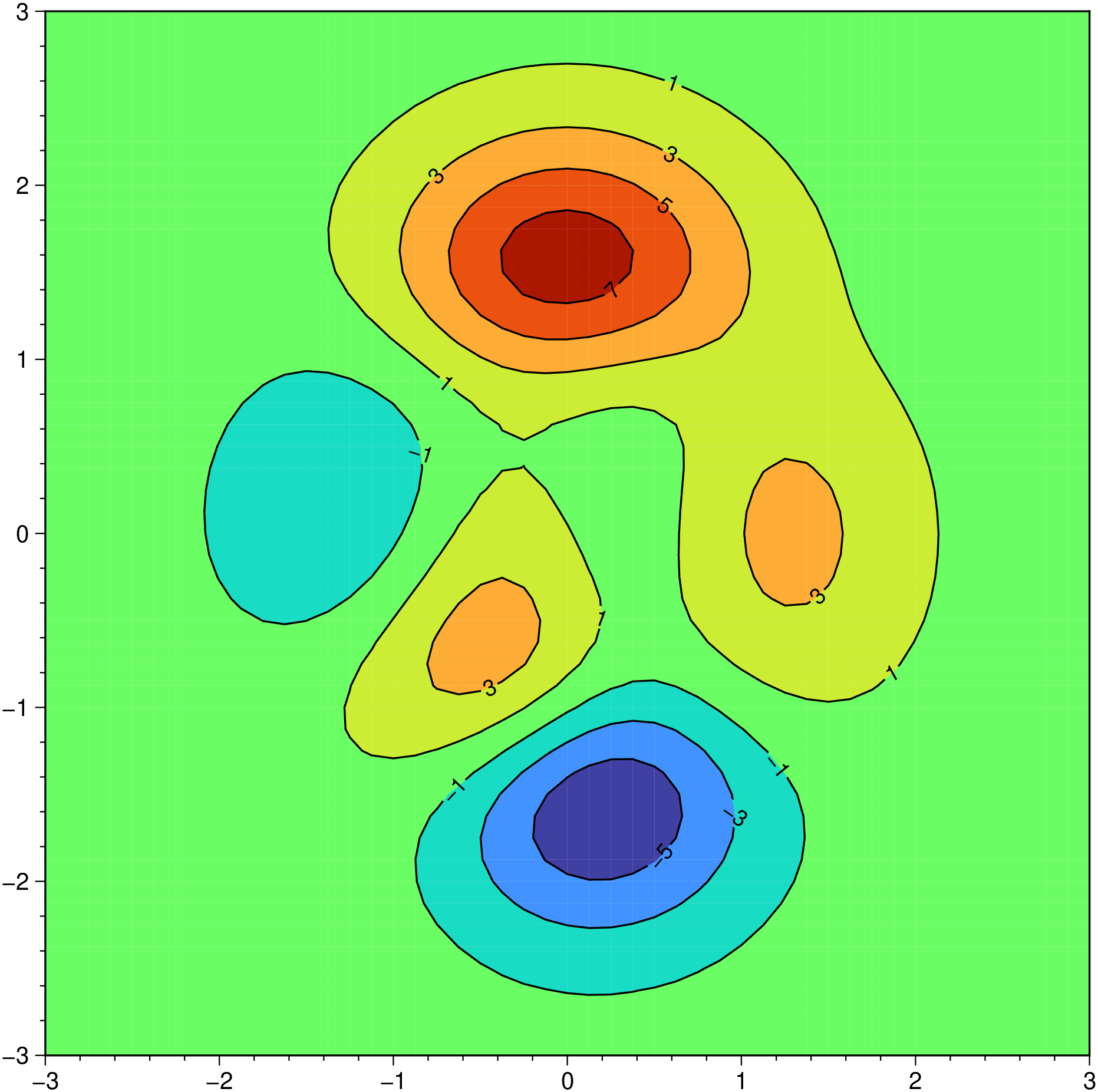 Contours are created with grdcontour that takes a grid as input (or a GMTgrid data type). This example shows uses the peaks function to create a classical example. Note, however, that the memory consumption in this example, when creating the plot, is much lower than traditional likewise examples because we will be using only one 2D array instead of 3 3D arrays (ref). In the example cont=1 and annot=2 means draw contours at every 1 unit of the G grid and annotate at every other contour line. axes=“a” means pick a default automatic annotation and labeling for the axes.
