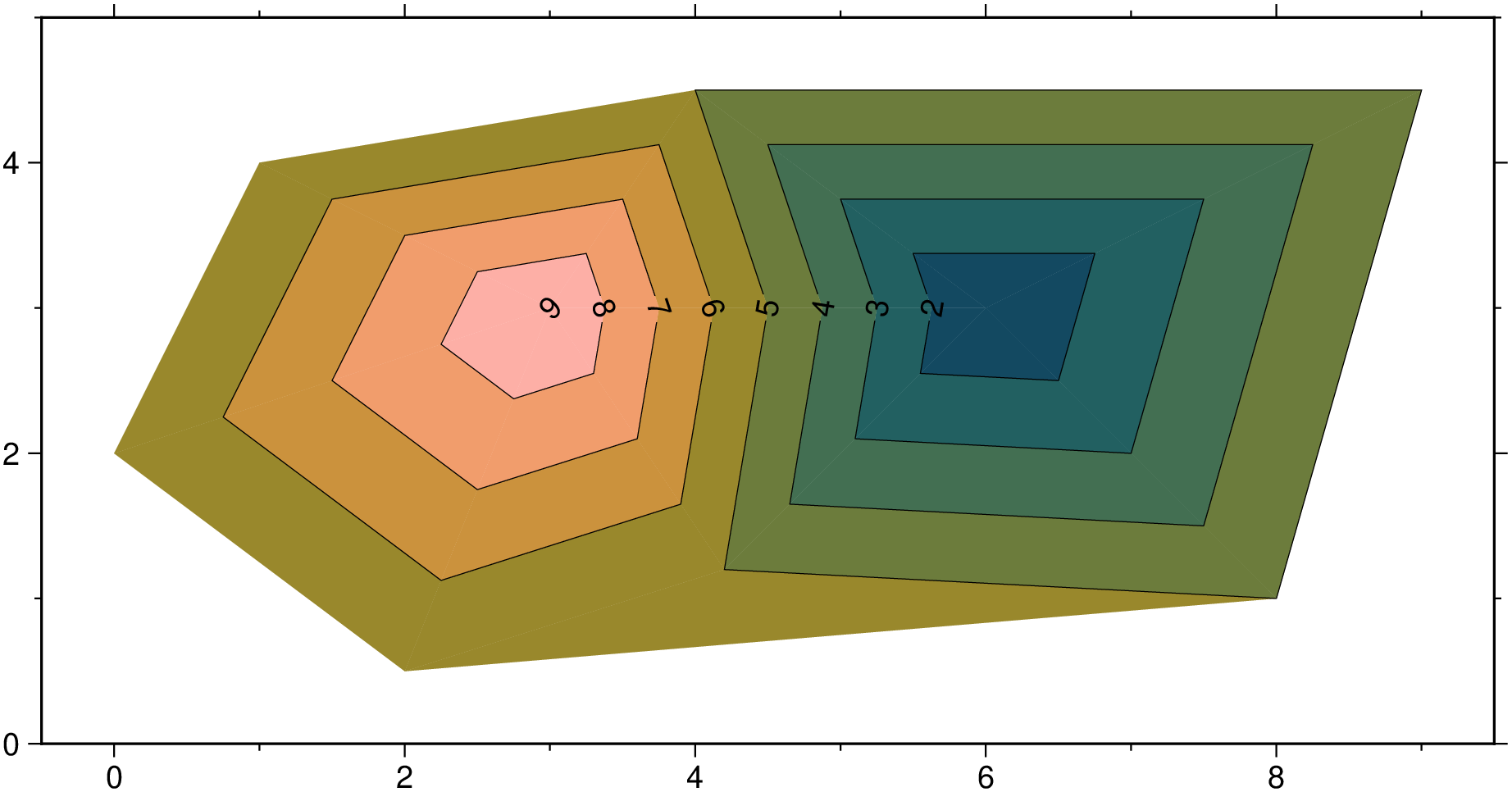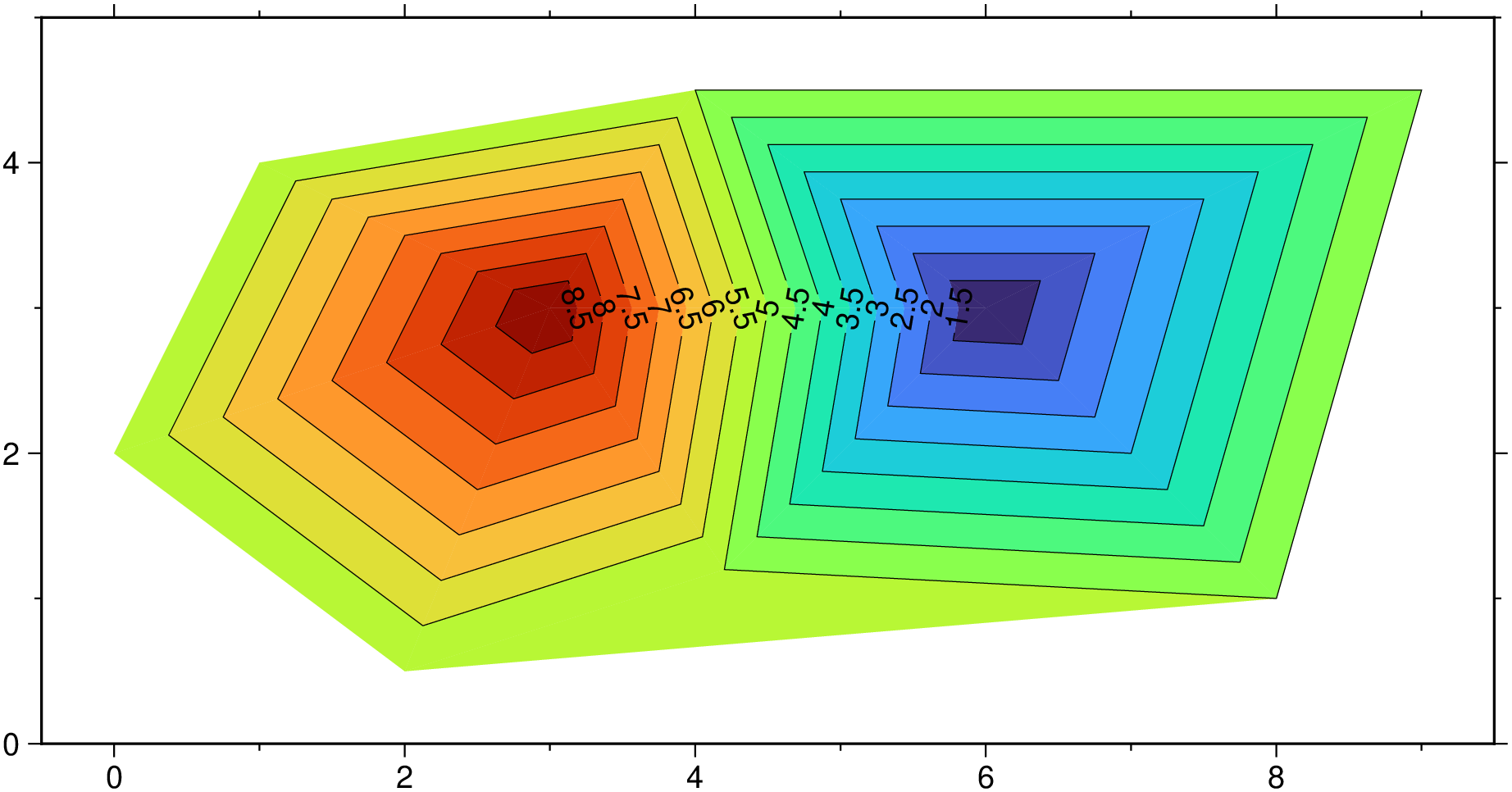 To make colored contours we need to generate a color map and use it. Notice that we must specify a pen attribute to get the colored contours because pen specifications are always set separately. Here we will create first a colormap with makecpt that will from -6 to 8 with steps of 1. These values are picked up after the z values of the G grid.