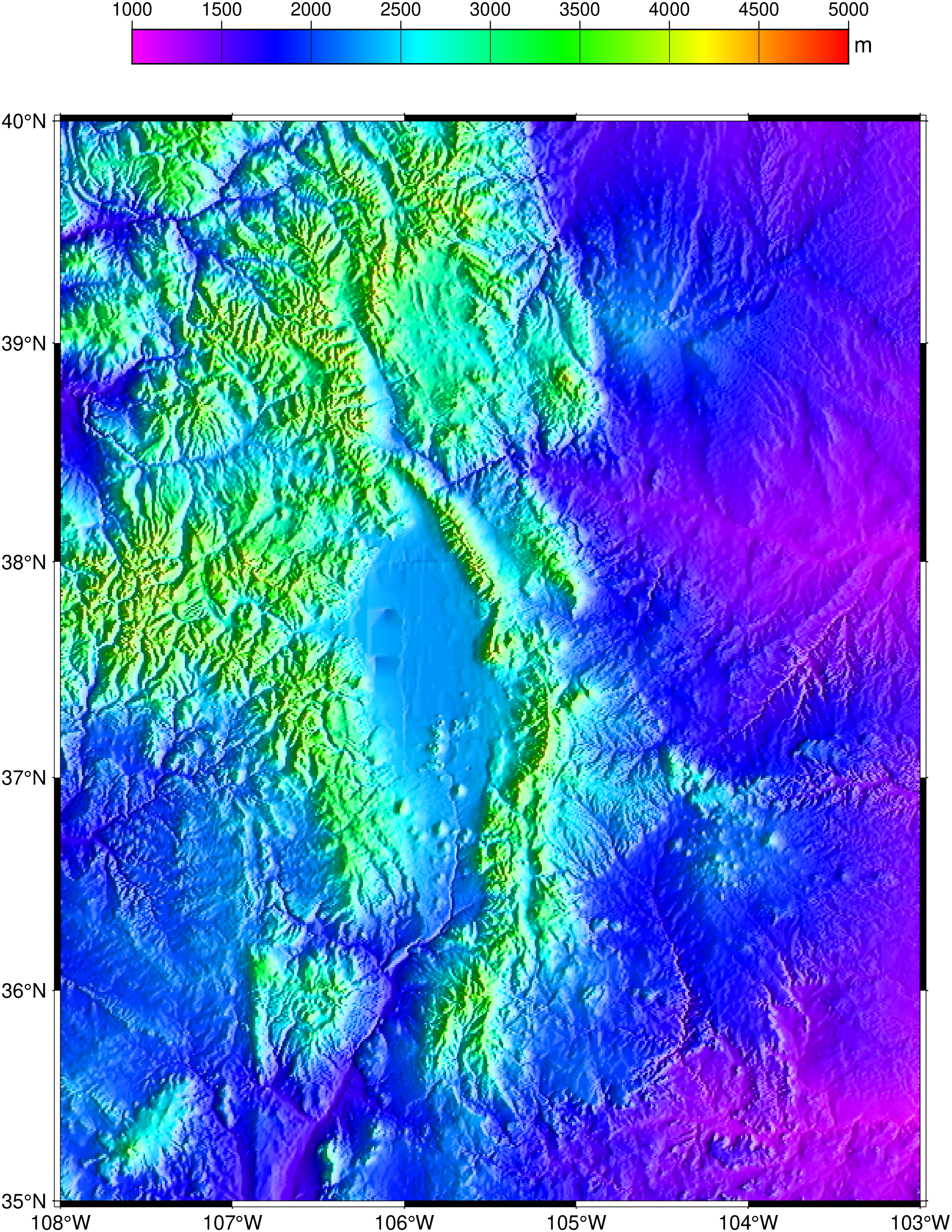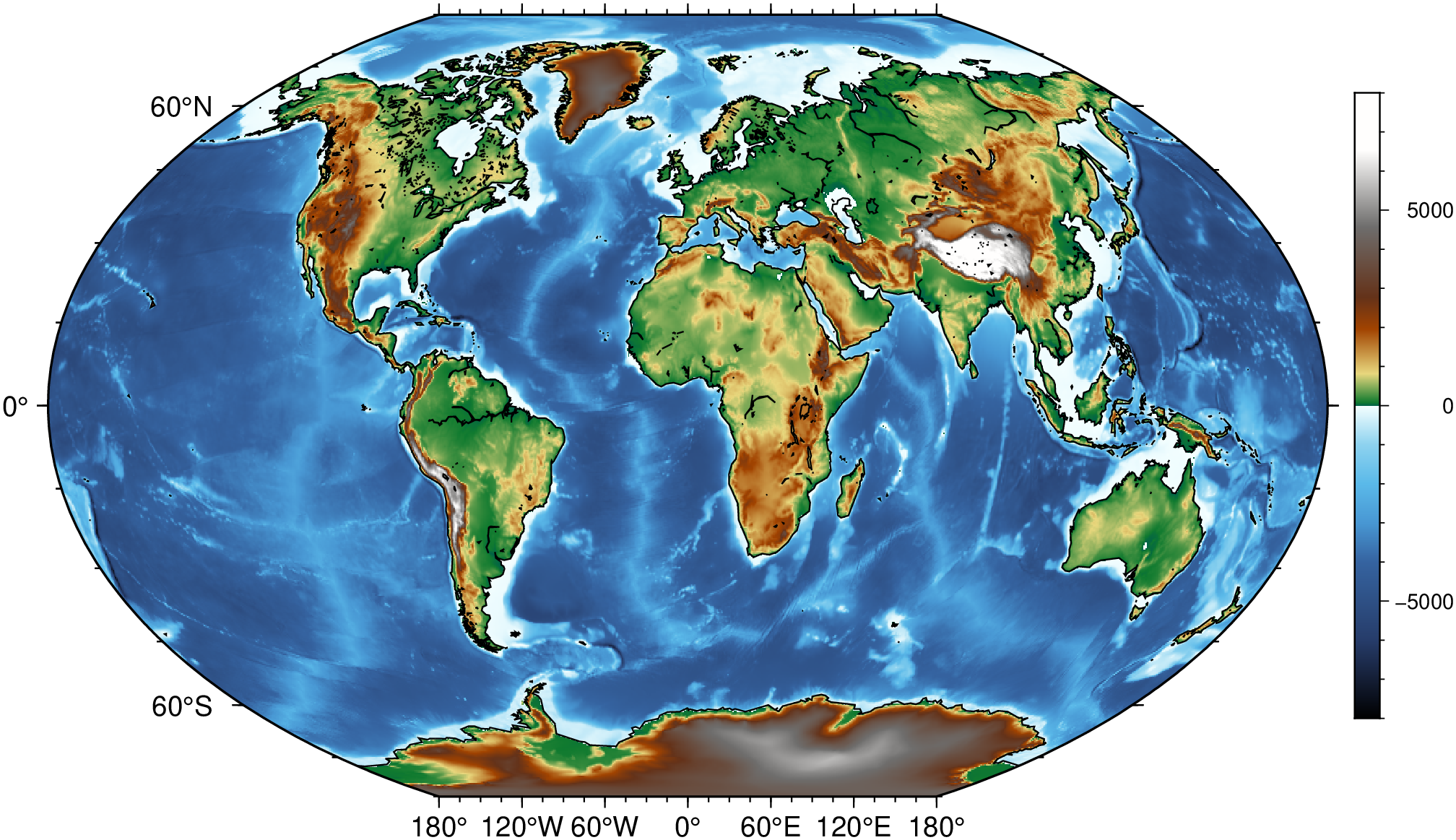 Color images are made with grdimage which takes the usual common options and a color map. It operates over grids or images. The next example shows how to create a color appropriate for the grid’s z range, plot the image and add a color scale. We use here the data keyword to tell the program to load the grid from a file. The @ before the tut_relief.nc file name instructs GMT to download the file from its server on the first usage and save it in a cache dir. See this GMT tutorial for more details about what the arguments mean.