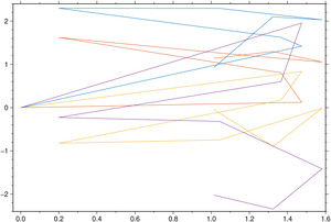 Here we are showing how to plot several lines at once and color them according to a circular color scheme comprised of 7 distinct colors. We start by generating a dummy matrix 8x5, where rows represent the vertex and the columns hold the lines. To tell the program that first column contains the coordinates and the remaining are all lines to be plotted we use the option multicol=true
