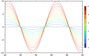 Normally we don’t need to start a figure with a call to basemap because the plot function takes care of guessing reasonable defaults, but in this case we start with a curve with small amplitude and we grow the figure by adding more lines. So if we leave it to automatic guessing one would have to start by the largest amplitude curve.