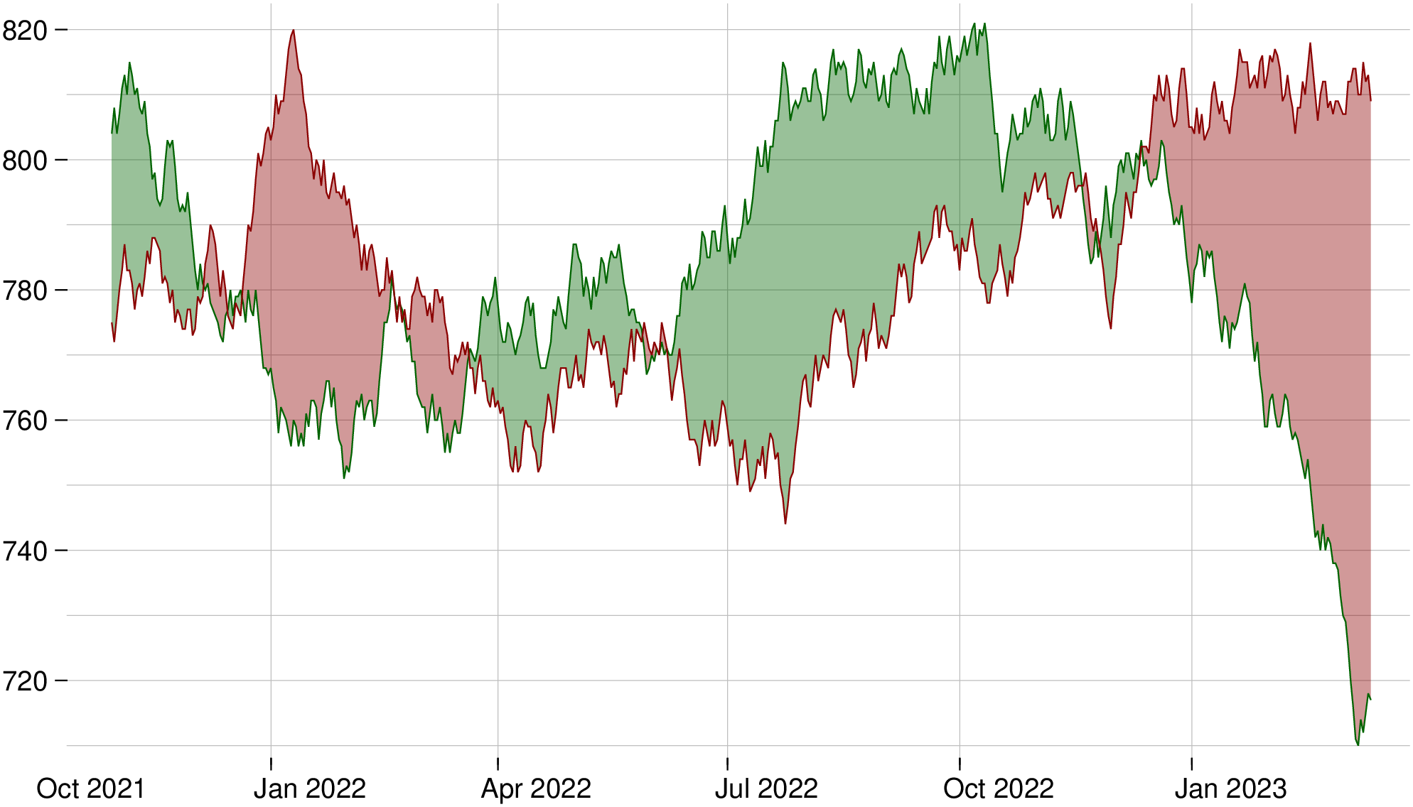 Next example hides the line and plots only the bands. Since when we ask for a color fill the lines is always plotted, the trick to no see it is to assign it full transparency. We use also a theme to change the default tick orientation and add automatic grid lines.