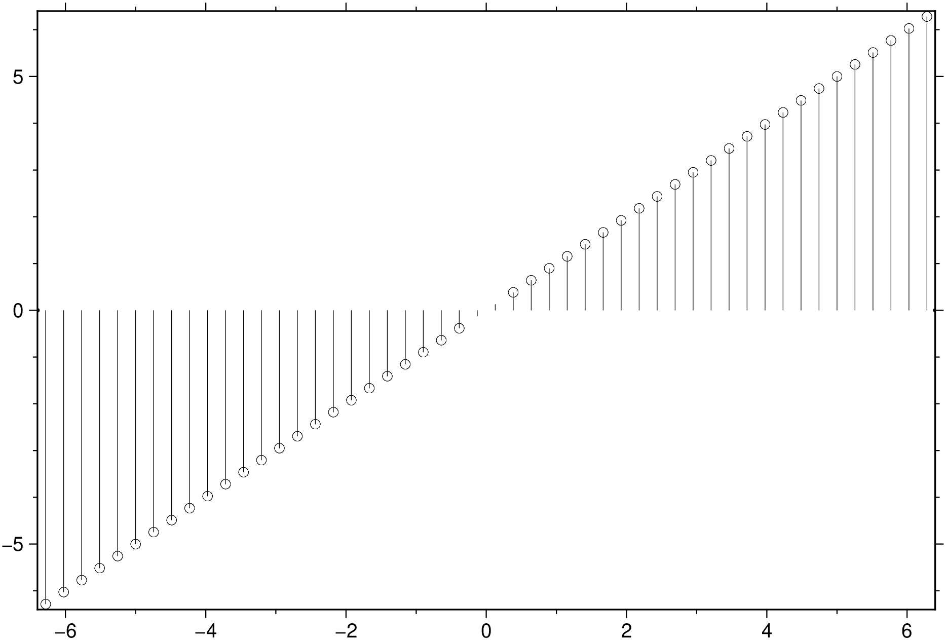 using GMT Y = linspace(-2*pi,2*pi,50); stem(Y, show=true)