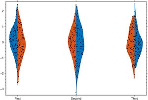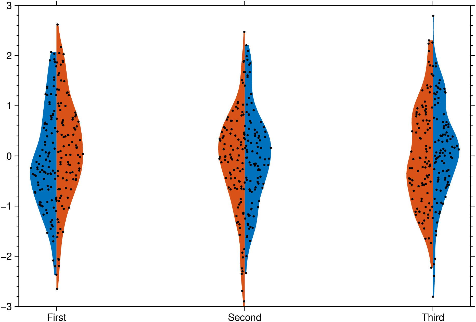 And a group example with red dashed separator lines and variable level of transparency for each element in the group. Note that this case uses input data as a Vector{Vector{Vector}}, which more representative of a real case as each violin is allowed to be made of a different number of observations.