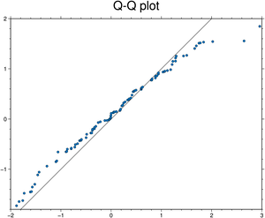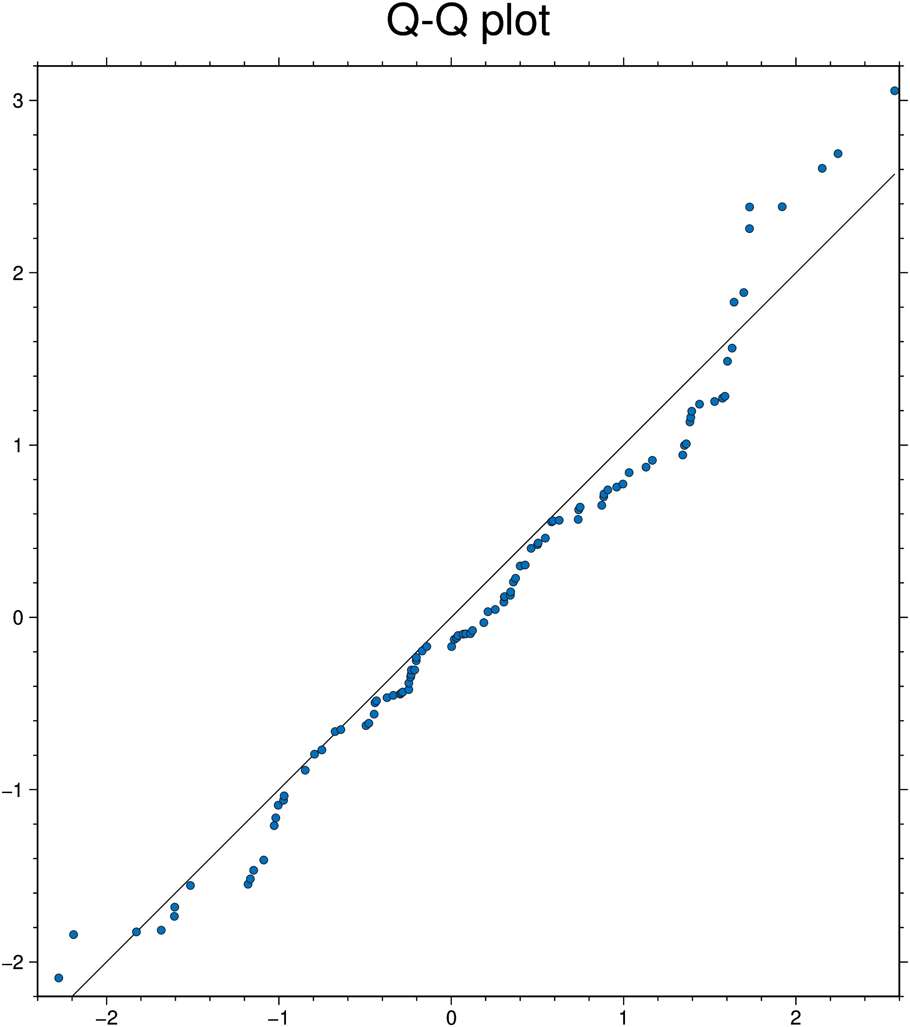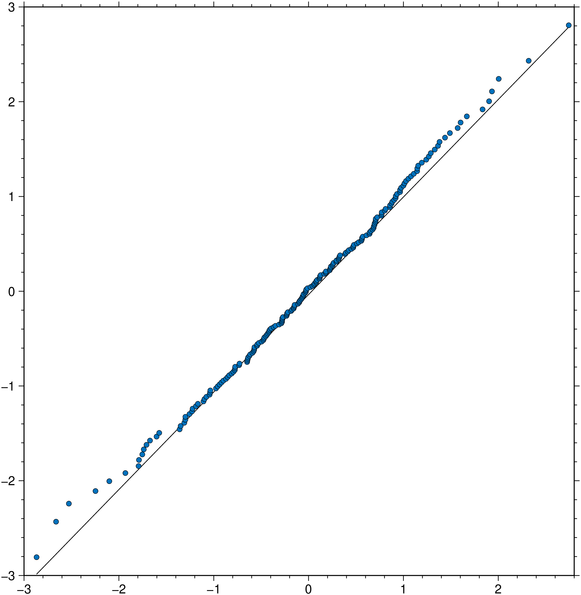 Test if x is normally distributed. the :fitrobust default line passes through the 1st and 3rd quartiles of the distribution