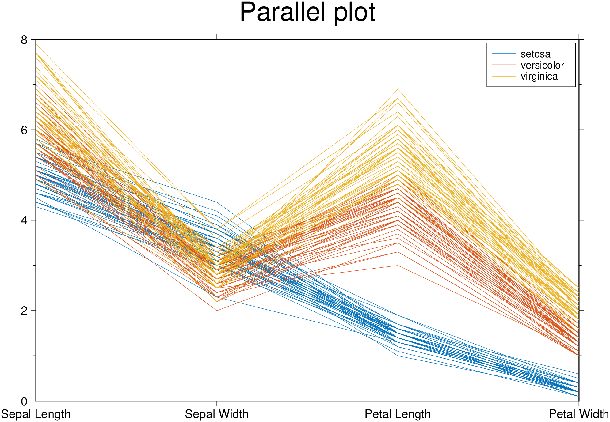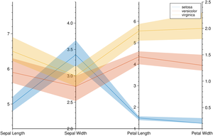 Create a parallel plot using the measurement data in iris.dat. Use a different color for each group as identified in species, and label the horizontal axis using the variable names.