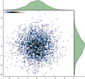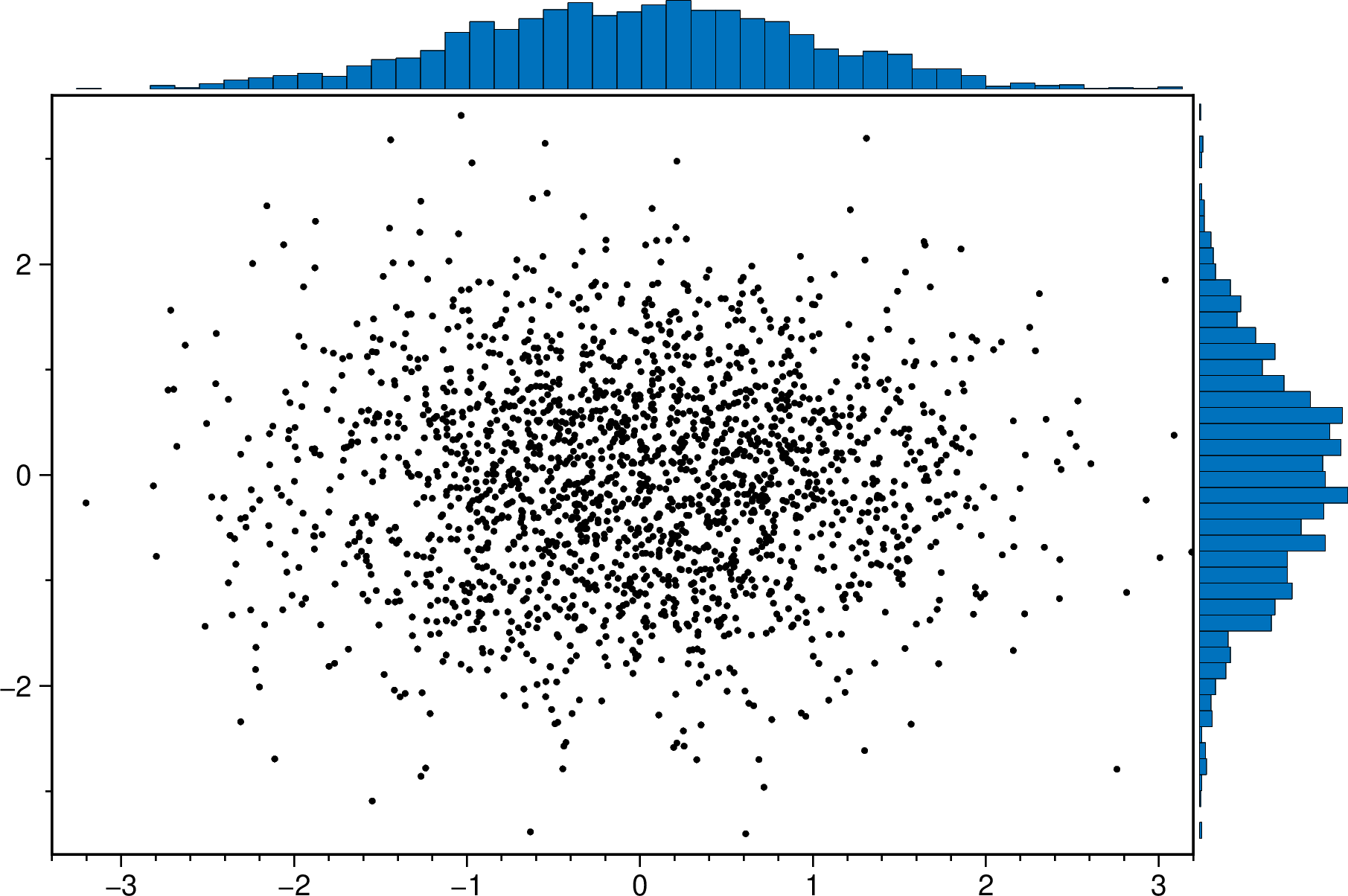An hexbin scater plot with marginal density plots. Note that we must set aspect=:equal to have that hexbin plot.