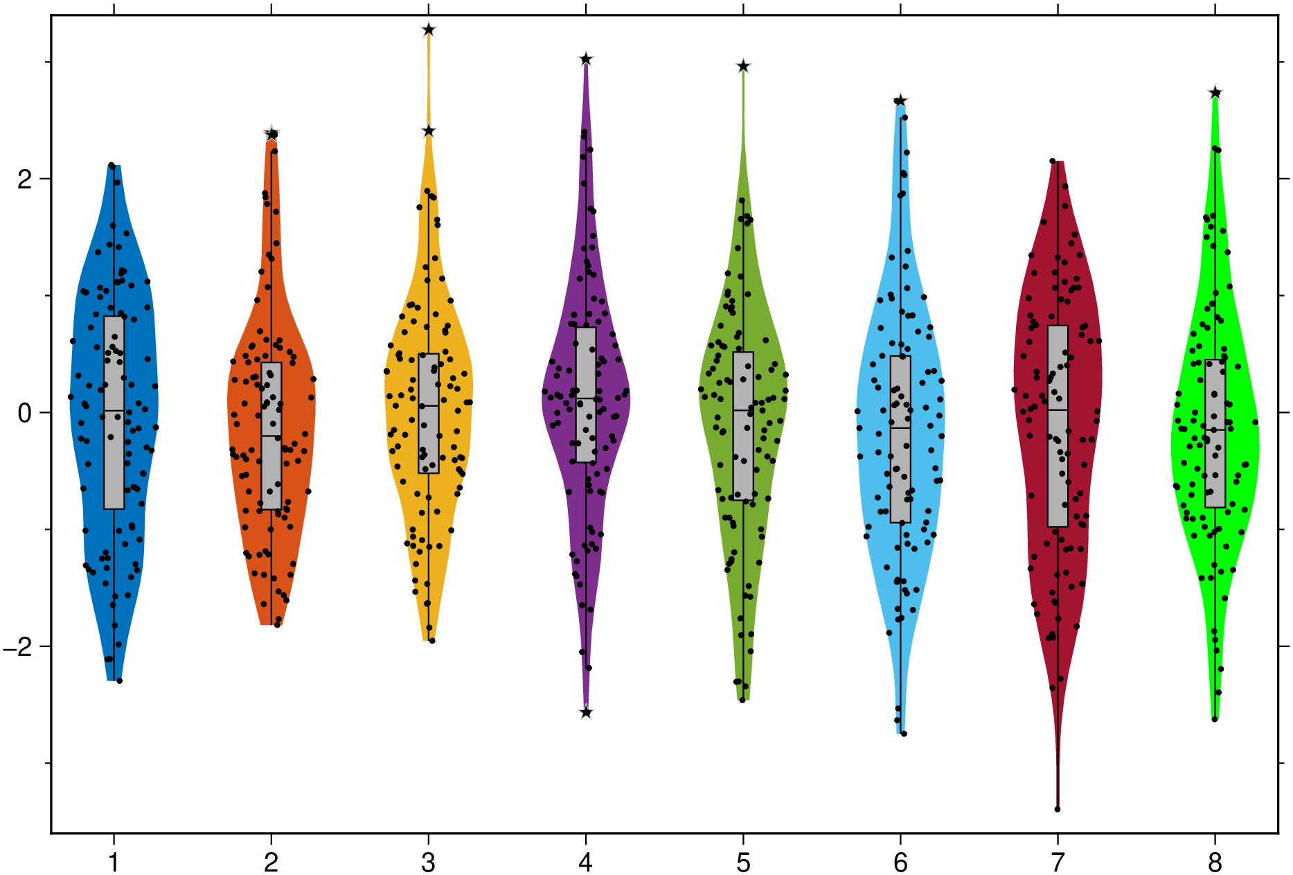 Now add boxplot, scatter and outliers to a plot similar to above. The outliers show as black stars with a fait gray outline.