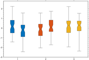 An horizontal boxplot with default colors, displaying outliers as 6p black stars. Noches are also shown but this requires GMT6.5.