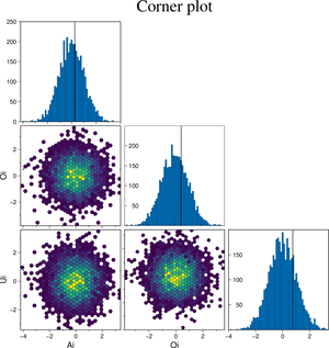 Create a cornerplot plot with hexagonal bins, setting the color map, the vriable names, plot truth and title.