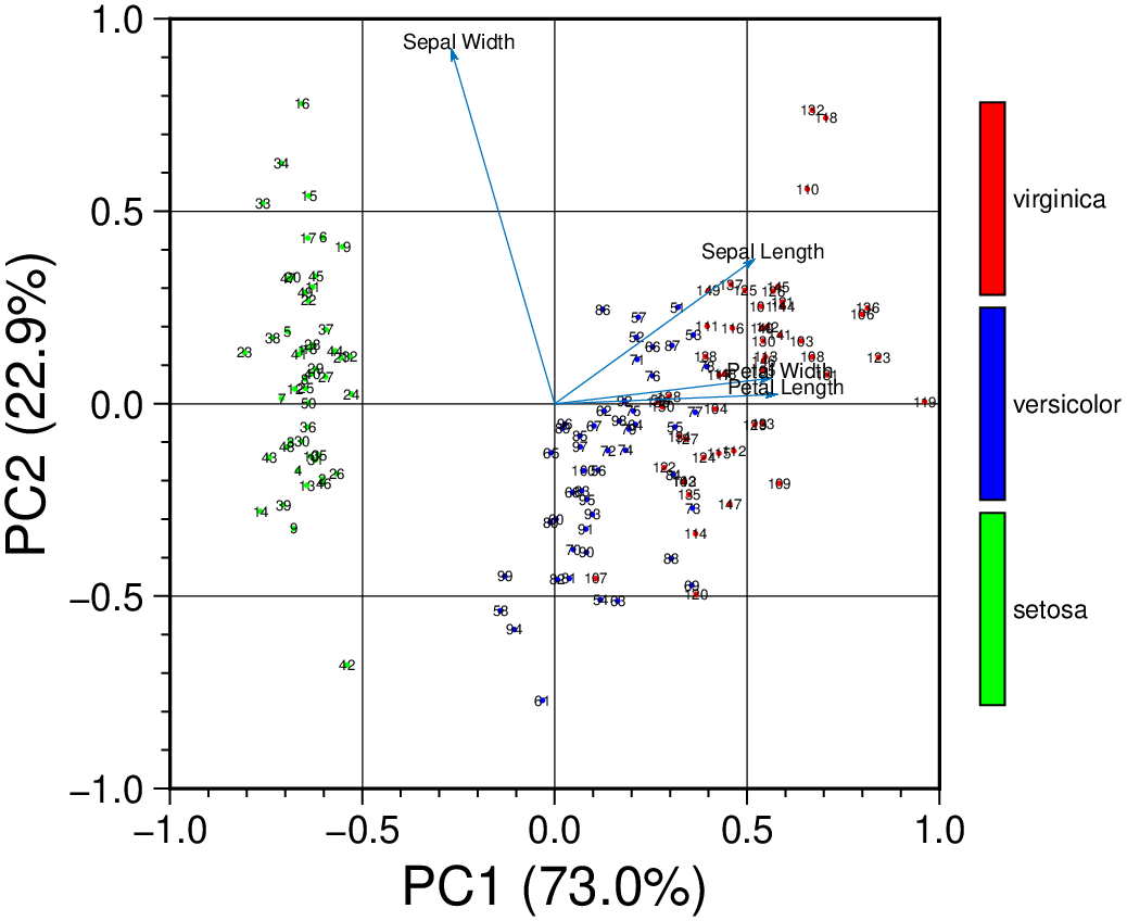 using GMT biplot(TESTSDIR * "iris.dat", figsize=6, obsnumbers=true, show=true)