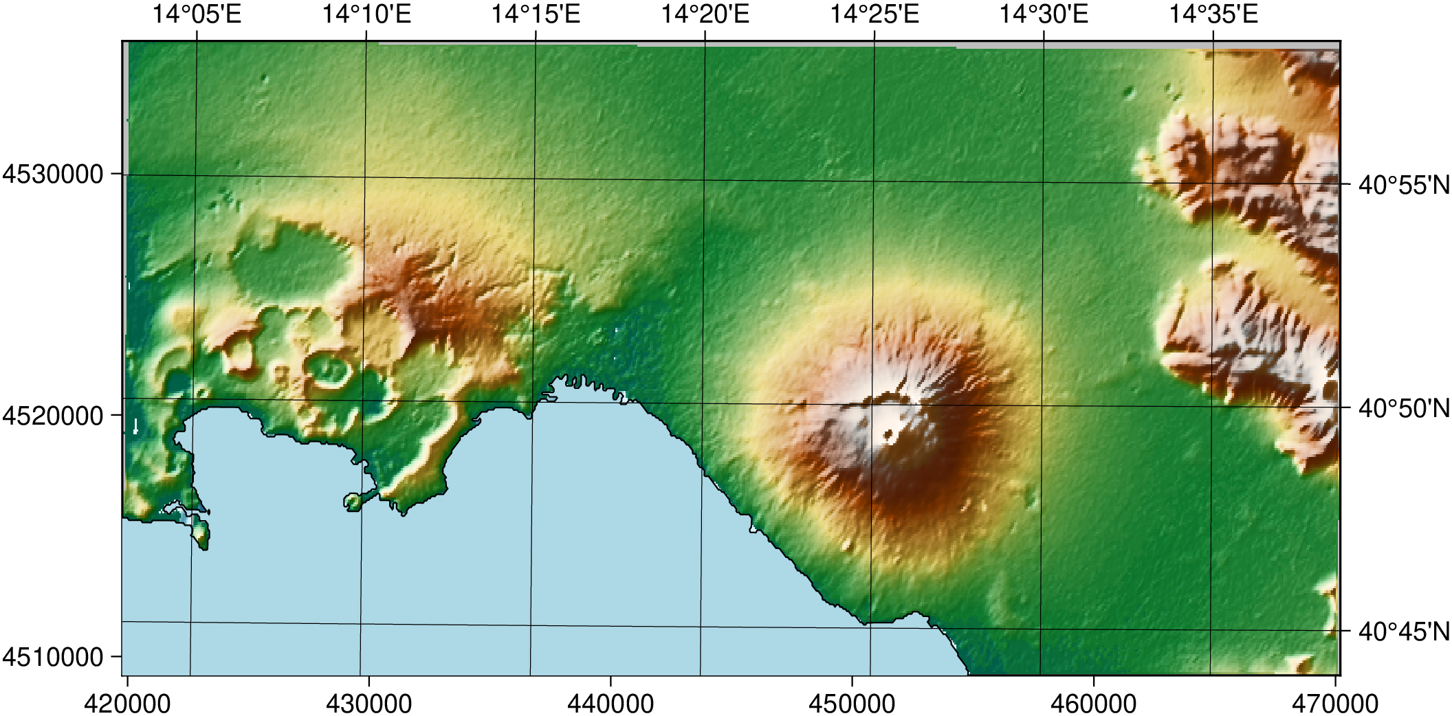 The above example, however, relied in having a UTM-referenced grid file already available. If you want to do the same with a global grid such as @earth_relief_03s, you can request a region in UTM coordinates and ask to project the fetched grid. This can be done on-the-fly by using the region, proj and the convert=true options in gmtread, like so: