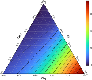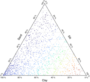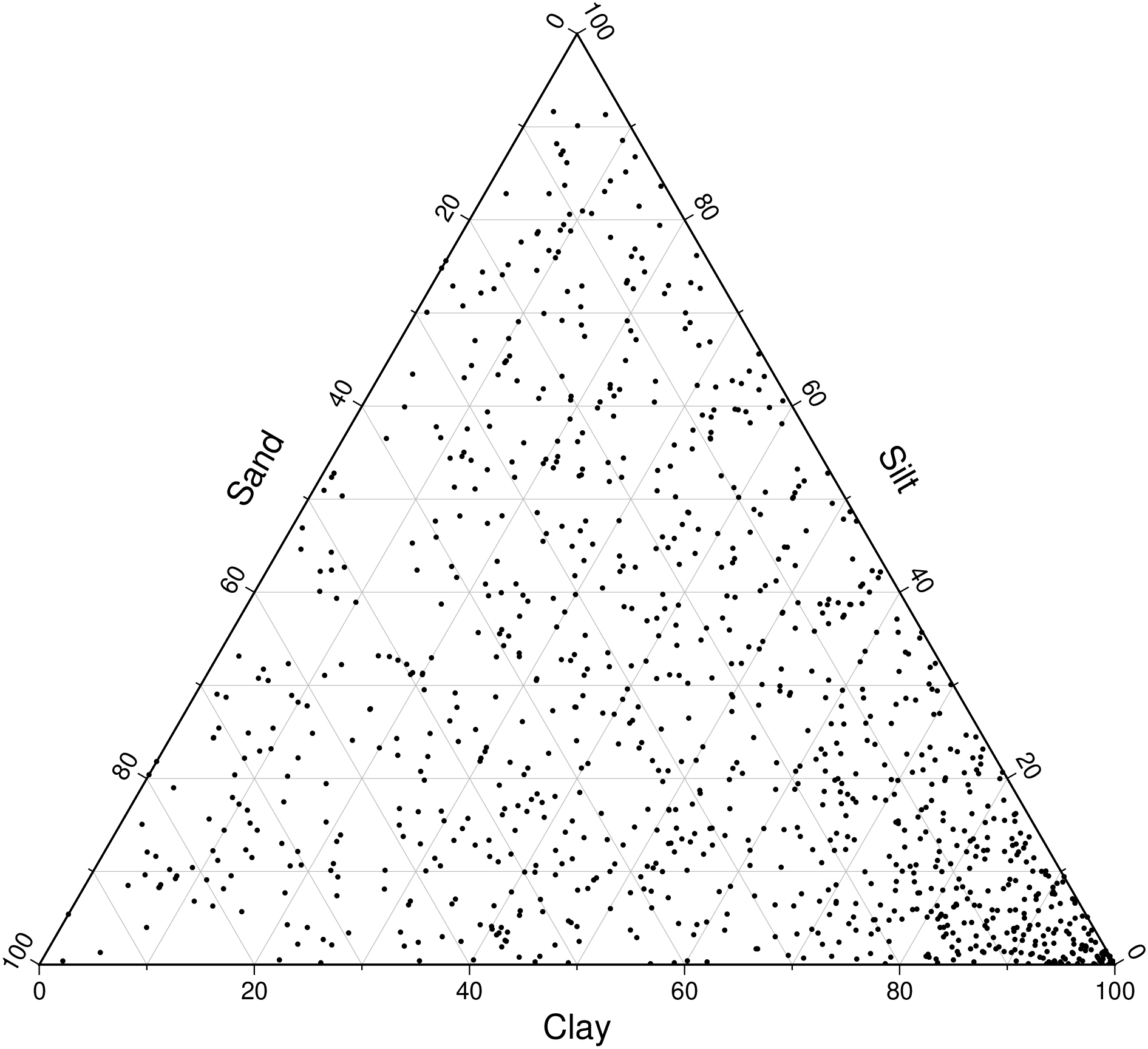 usingGMT# Make use of the knowledge that z ranges berween 0 and 71 (gmtinfo module is a friend)C =makecpt(T=(0,71));ternary("@ternary.txt", marker=:p, cmap=C, clockwise=true, frame=(annot=:auto, grid=:a, ticks=:a, alabel="Clay", blabel="Silt", clabel="Sand", suffix=" %"), show=true)