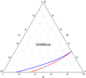 usingGMTb =0:0.01:0.3c1 = (1.- b).^3.-0.7^3c2 = (1.-2*b).^2.-0.4^2# Generate the coordinates of two lines.t1 =tern2cart([(1.- b .- c1) b c1]) # Note that GMT.jl function expects a Mx3 matrixt2 =tern2cart([(1.- b .- c2) b c2])ternary(labels=("A", "B", "C"))plot!(t1, lw=2, lc=:red, ls="line& (a) &") # line style -> fancy stuffplot!(t2, lw=2, lc=:blue)text!(tern2cart([0.30.40.3]), text="Umbilicus", font=18, show=true)