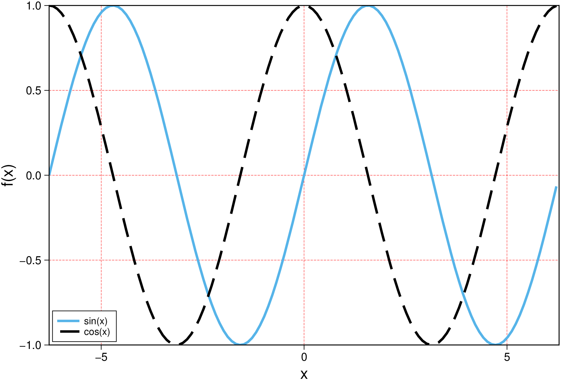 lines!(x, cos.(x), lw=2, linestyle=:dash, legend=(label="cos(x)", pos=:BL), show=true)