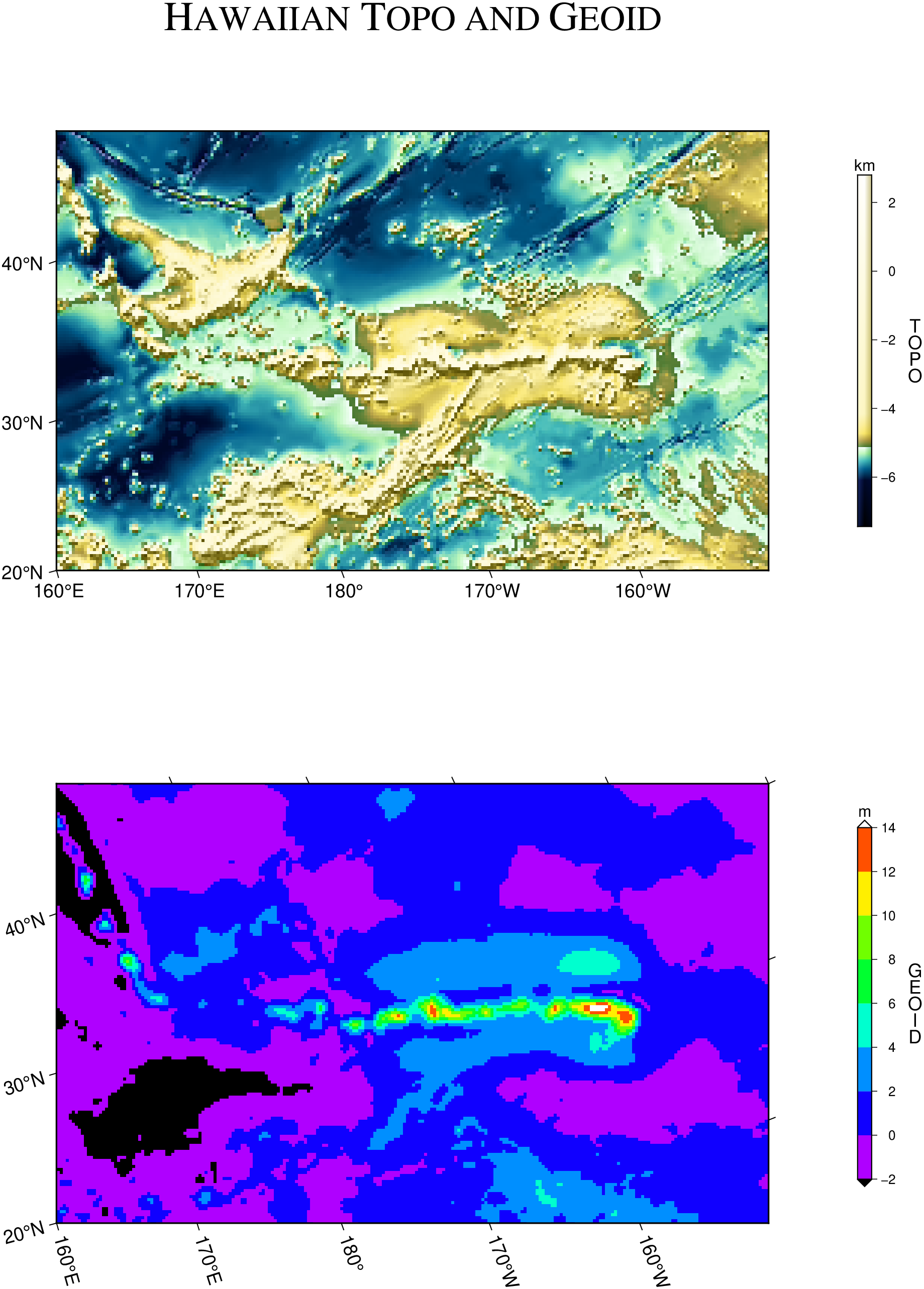 As our second example we will demonstrate how to make color images from gridded data sets (again, we will defer the actual making of grid files to later examples). We have prepared two 2-D grid files of bathymetry and Geosat geoid heights from global grids and will put the two images on the same page. The region of interest is the Hawaiian Islands, and due to the oblique trend of the island chain we prefer to rotate our geographical data sets using an oblique Mercator projection defined by the hotspot pole at (68W, 69N). We choose the point (190, 25.5) to be the center of our projection (e.g., the local origin), and we want to image a rectangular region defined by the longitudes and latitudes of the lower left and upper right corner of region. In our case we choose (160, 20) and (220, 30) as the corners. We twice use [grdimage] to make the illustration: