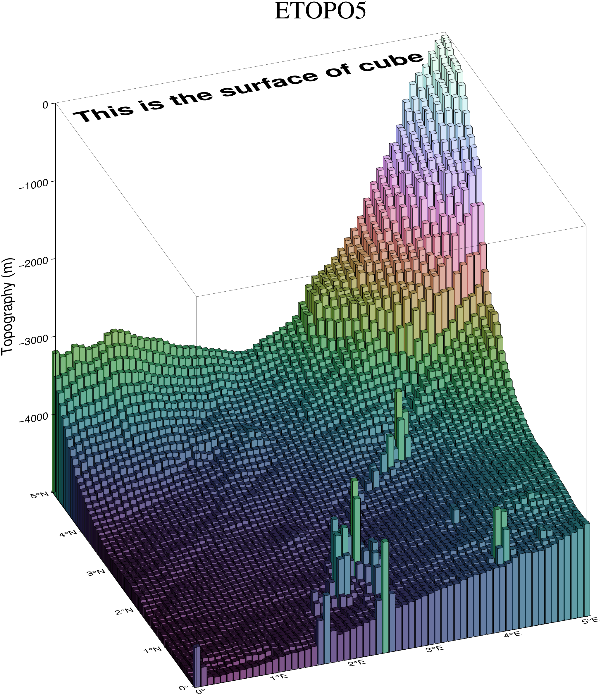 The program [plot3d] allows us to plot three-dimensional symbols, including columnar plots. As a simple demonstration, we will convert a gridded netCDF of bathymetry into an ASCII xyz table and use the height information to draw a 2-D histogram in a 3-D perspective view. We also use the height information to set to color of each column via a CPT file. Our gridded bathymetry file is the 5 arc-minute global relief. Depth ranges from -5000 meter to sea-level. We produce the Figure by running this script: