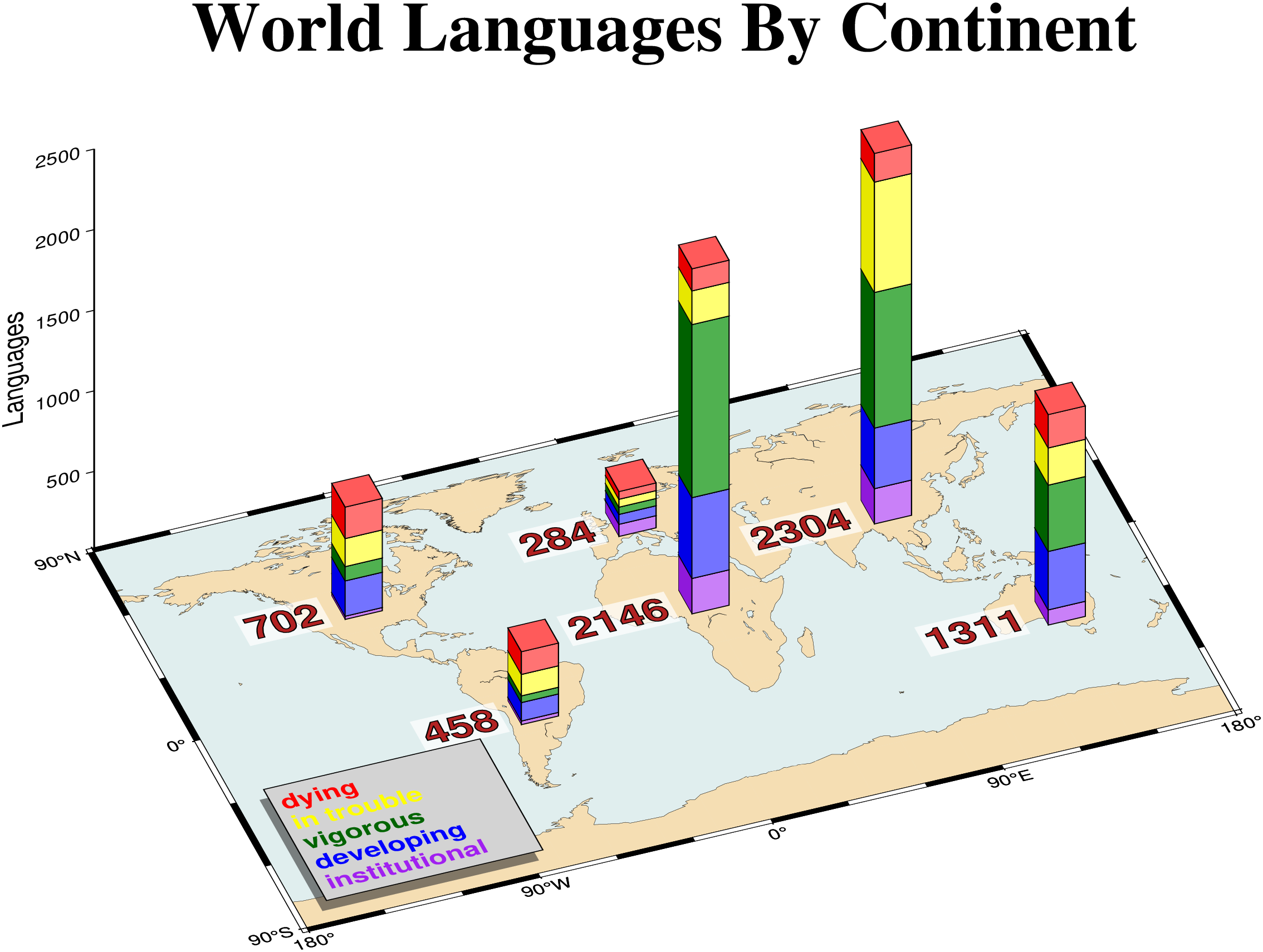 frame=(axes=:WSneZ, annot=:auto, ticks=:auto, title="World Languages By Continent"),