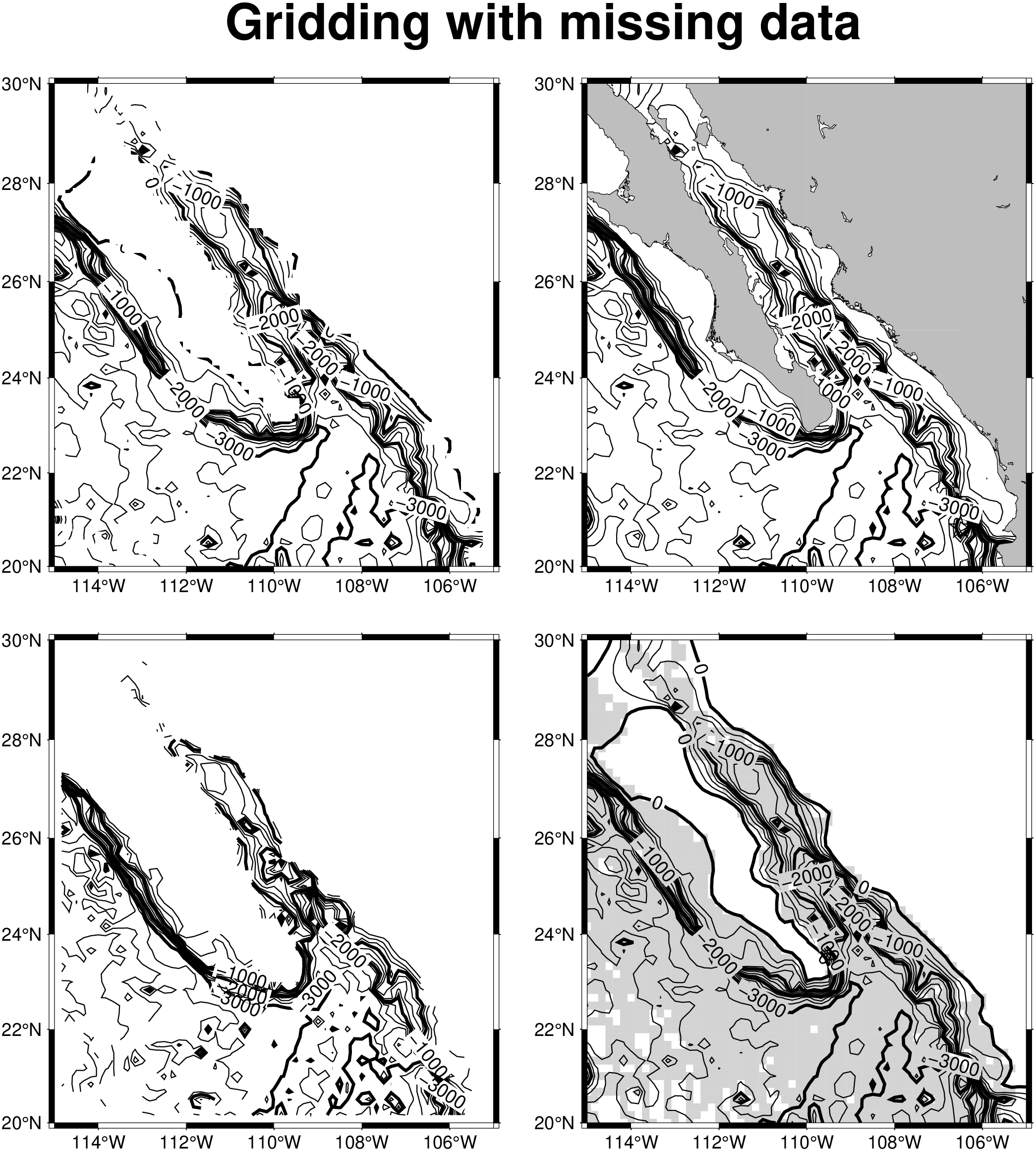 text!(text_record([-0.3 3.6], "Gridding with missing data"), region=(0,3,0,4),