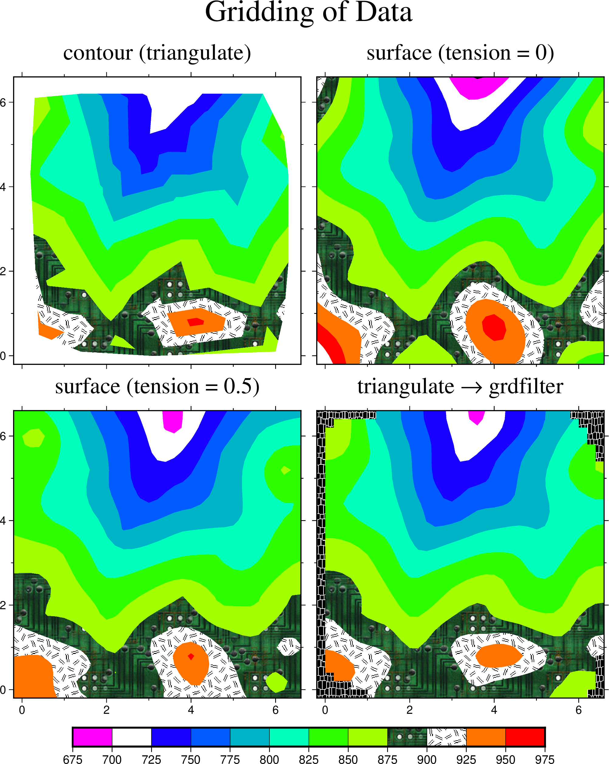 A more serious objection is that [surface] may estimate z values outside the local range of the data (note area near x = 0.8, y = 5.3). This commonly happens when the default tension value of zero is used to create a “minimum curvature” (most smooth) interpolant. [surface] can be used with non-zero tension to partially overcome this problem. The limiting value tension = 1 should approximate the triangulation, while a value between 0 and 1 may yield a good compromise between the above two cases. A value of 0.5 is shown in the Figure More ways to grid data. A side effect of the tension is that it tends to make the contours turn near the edges of the domain so that they approach the edge from a perpendicular direction. A solution is to use surface in a larger area and then use [grdcut] to cut out the desired smaller area. Another way to achieve a compromise is to interpolate the data to a grid and then filter the grid using [grdfft] or [grdfilter]. The latter can handle grids containing “NaN” values and it can do median and mode filters as well as convolutions. Shown here is [triangulate] followed by [grdfilter]. Note that the filter has done some extrapolation beyond the convex hull of the original x, y values. The “best” smooth approximation of z(x, y) depends on the errors in the data and the physical laws obeyed by z. GMT cannot always do the “best” thing but it offers great flexibility through its combinations of tools. We illustrate all four solutions using a CPT that contains color fills, predefined patterns for interval (900,925) and NaN, an image pattern for interval (875,900), and a “skip slice” request for interval (700,725). Again, we use subplot to set up and place the four panels, and place the colorbar beneath the subplot.