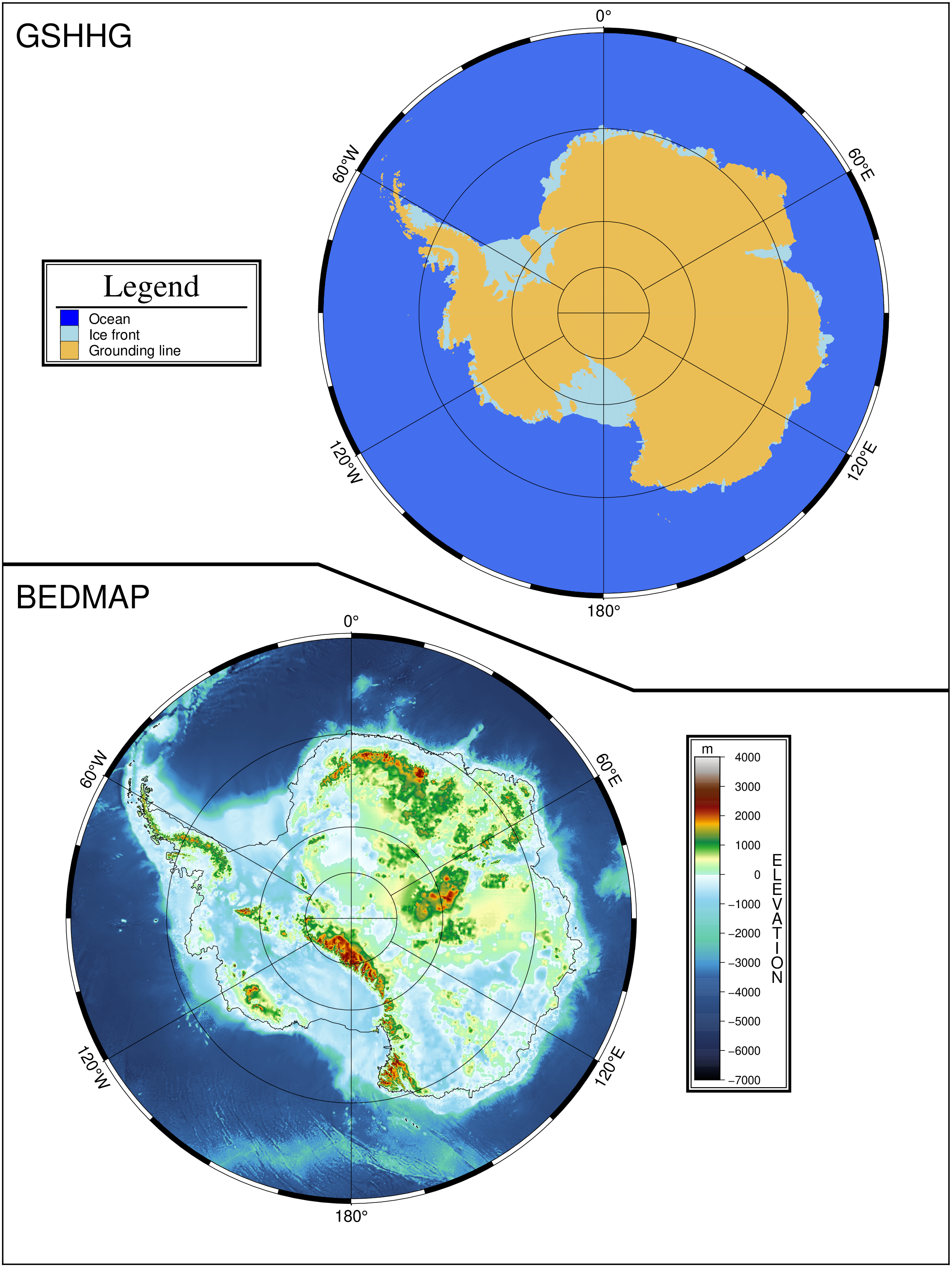 text!(text_record([0 5.2; 0 9.65], ["BEDMAP", "GSHHG"]), font=18, justify=:BL,