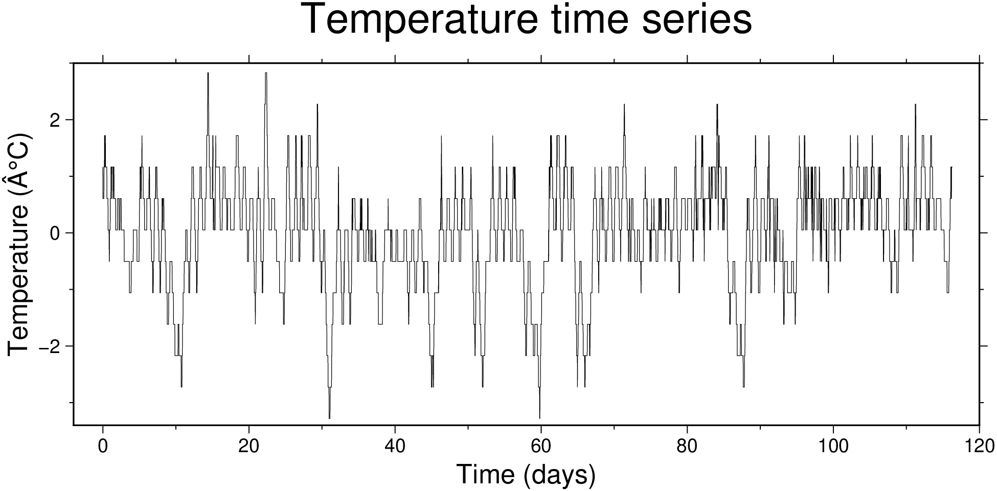 Consider a set of temperature data collected by a thermometer inside an office building. The device takes a reading every half hour for four months. Load the data and plot it. Subtract the mean to concentrate on temperature fluctuations. Convert the temperature to degrees Celsius. Measure time in days. The sample rate is thus 2 measurements/hour × 24 hours/day = 48 measurements/day.