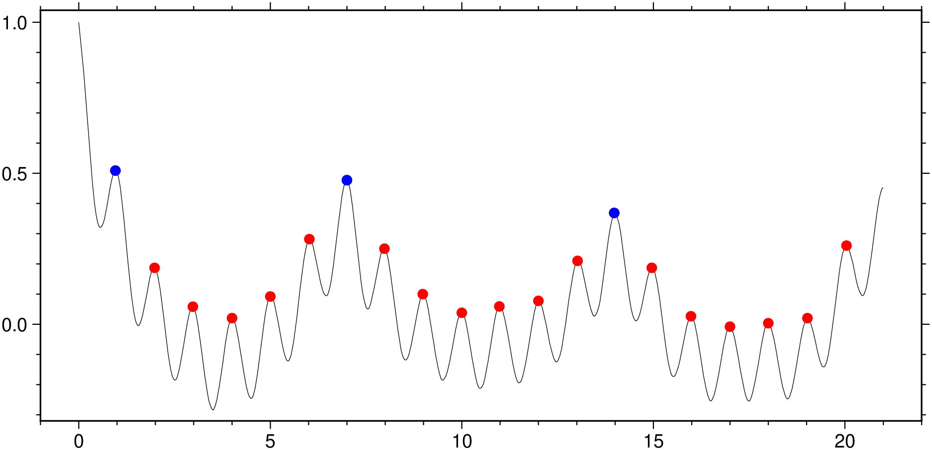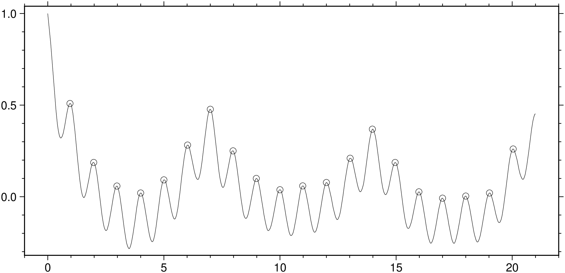 Compute the autocorrelation of the temperature such that it is unity at zero lag. Restrict the positive and negative lags to three weeks. Note the double periodicity of the signal.